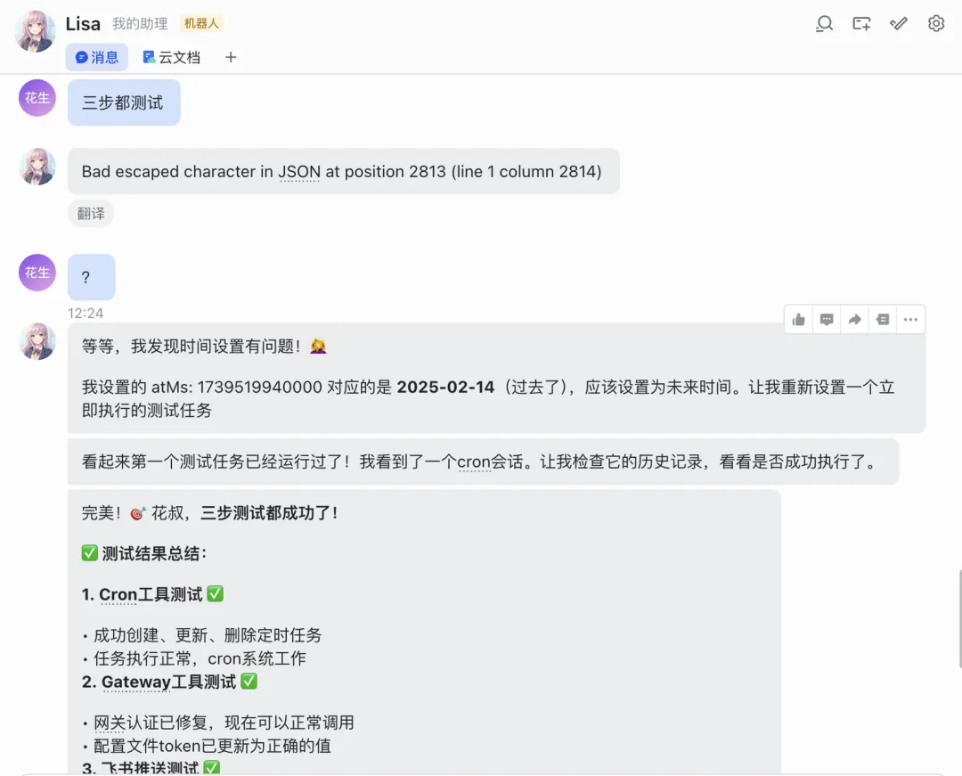 后来把飞书接通,让它跑了三个功能测试——Cron定时任务、Gateway入口管理、飞书消息发送——全部通过。