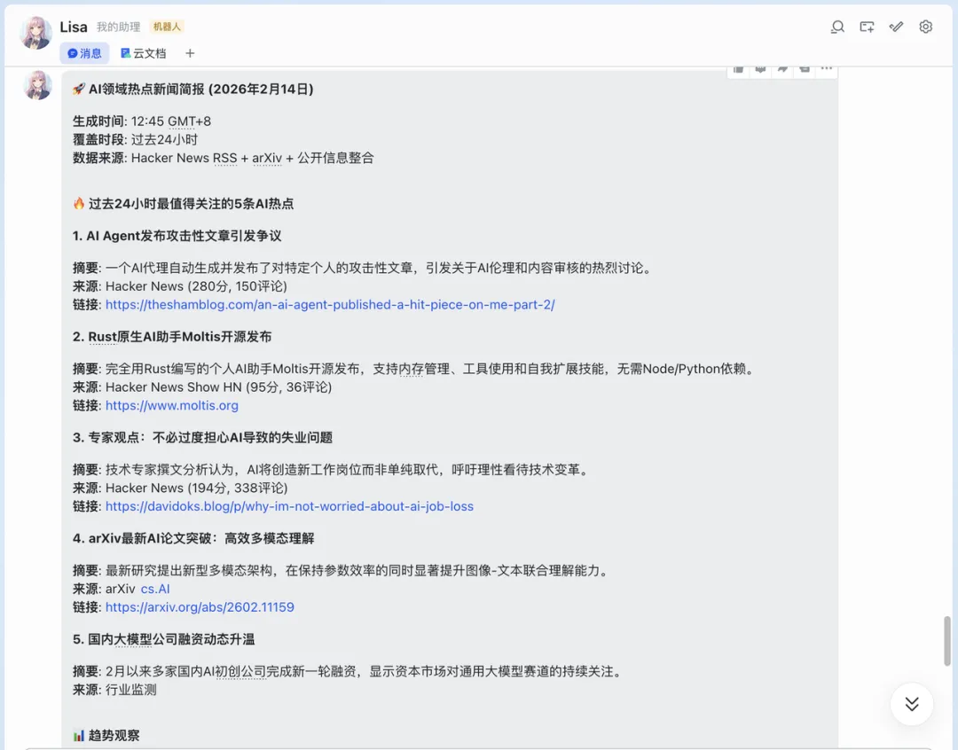 我在飞书里给OpenClaw发了一条指令:「帮我搜索过去24小时AI领域最值得关注的5条热点新闻,每条附上一句话摘要和来源链接,按重要程度排序。」