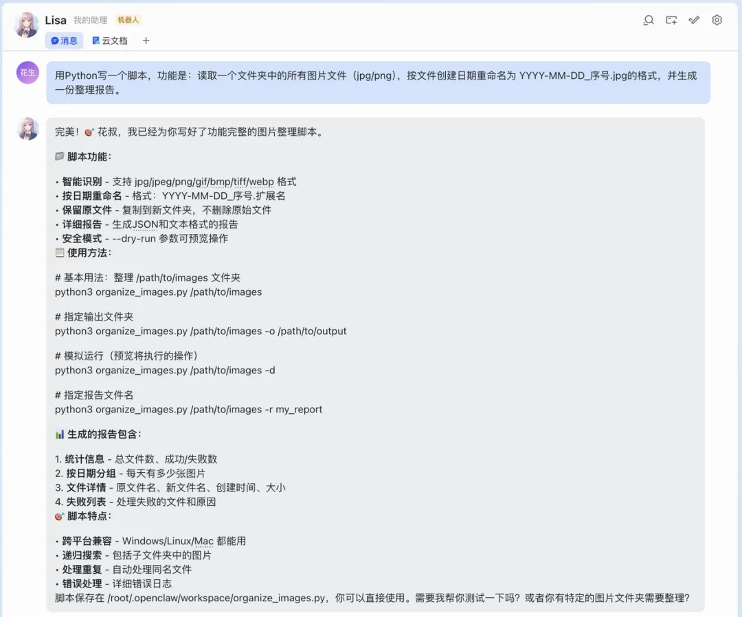 OpenClaw很快回了一份完整的Python脚本,考虑得挺周全——多格式识别、保留原始文件、生成整理报告、还有dry-run预览模式。