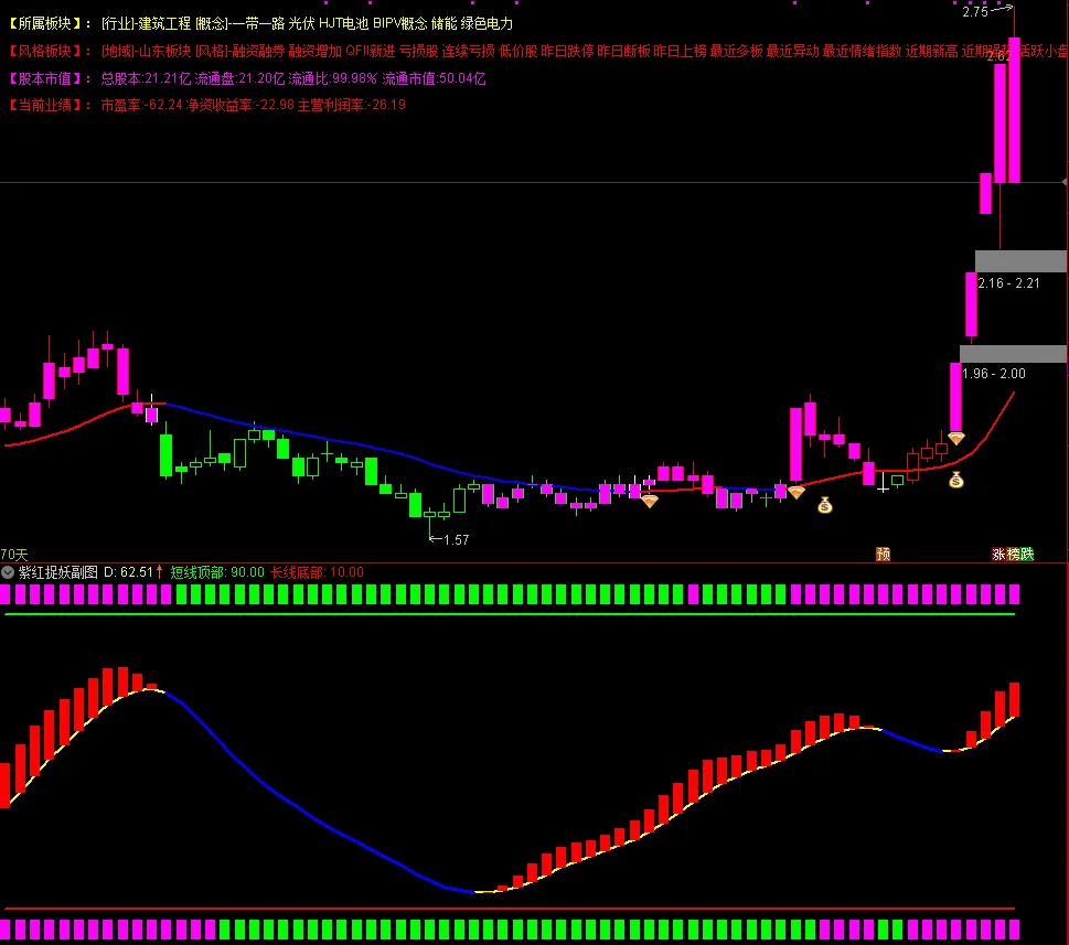 E线(核心趋势线): 对收盘价进行两次10日指数平滑,形成一条平滑的趋势线。其独特之处在于用红色表示今日E线值上升(趋势向上),用蓝色表示今日E线值下降(趋势向下),对趋势转折点提示敏感。