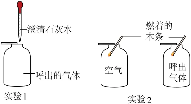 13. 用如图实验探究吸入空气和呼出气体的不同。实验2中观察到燃着的木条在呼出气体中先熄灭。下列说法正确的是