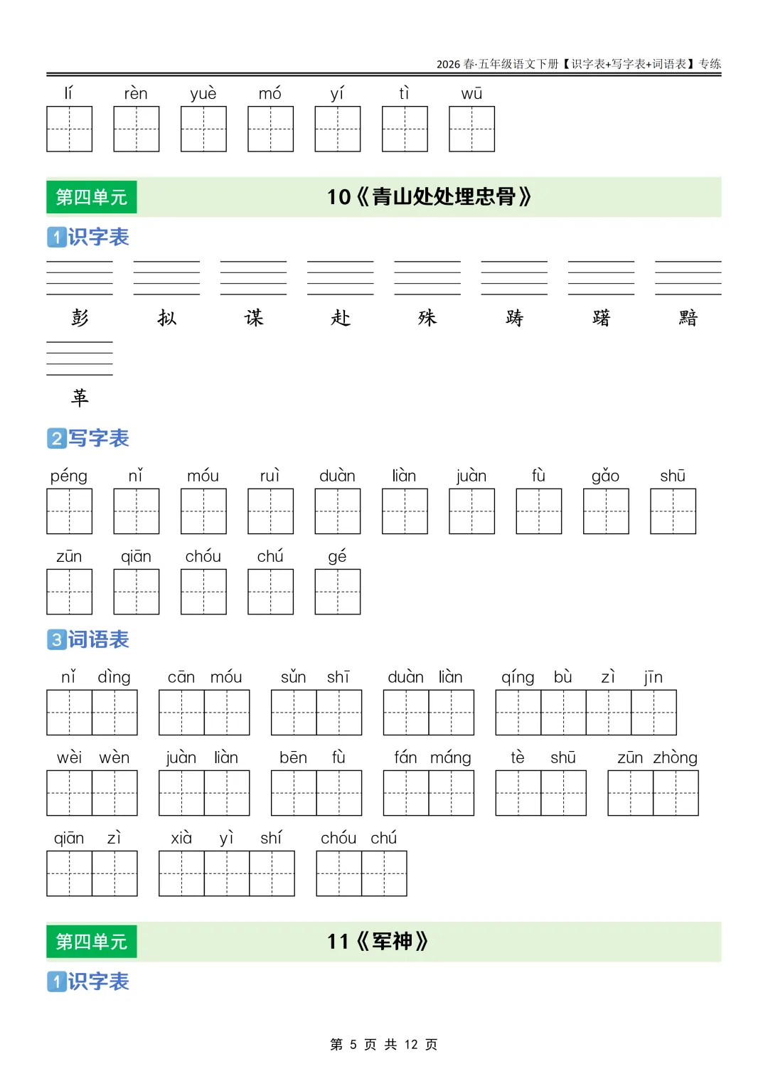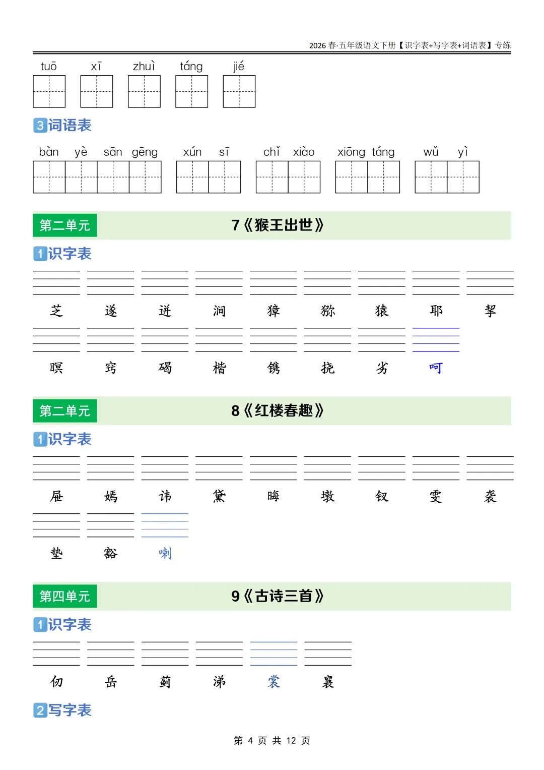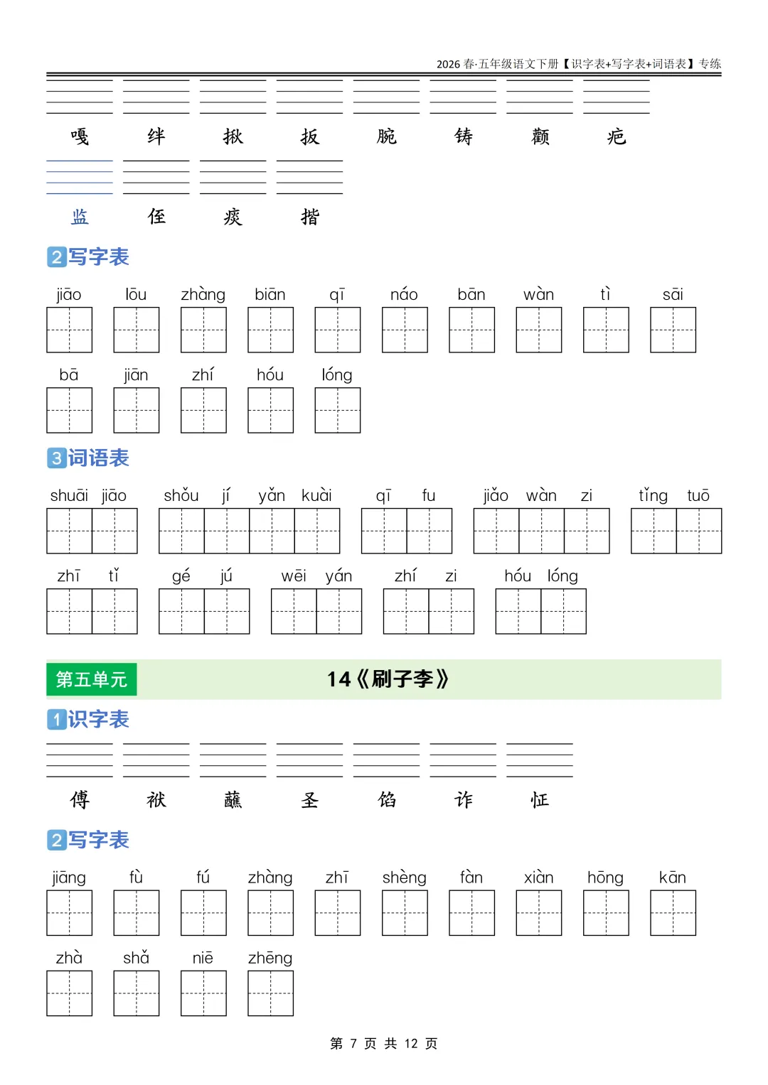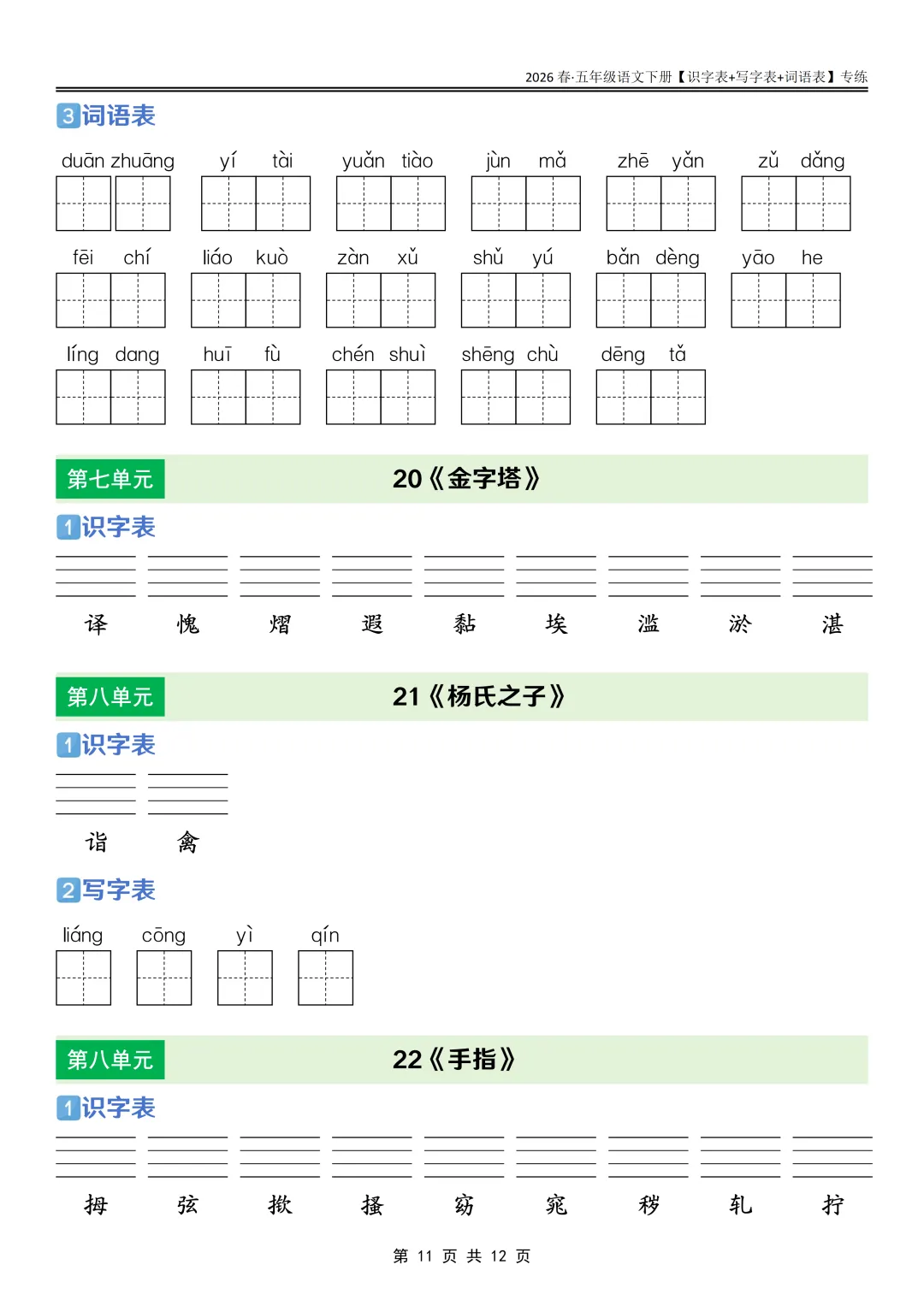 26春语文《课后三表专练》五年级下册,PDF可下载打印