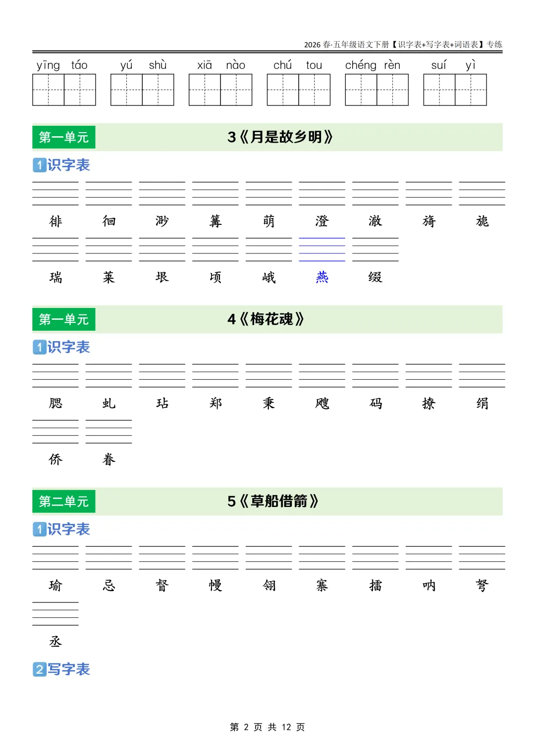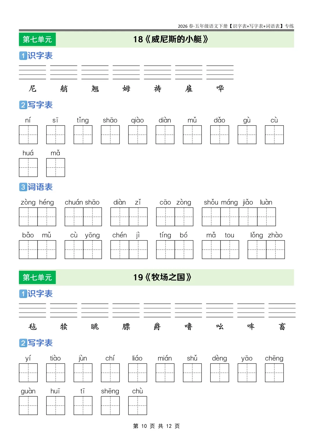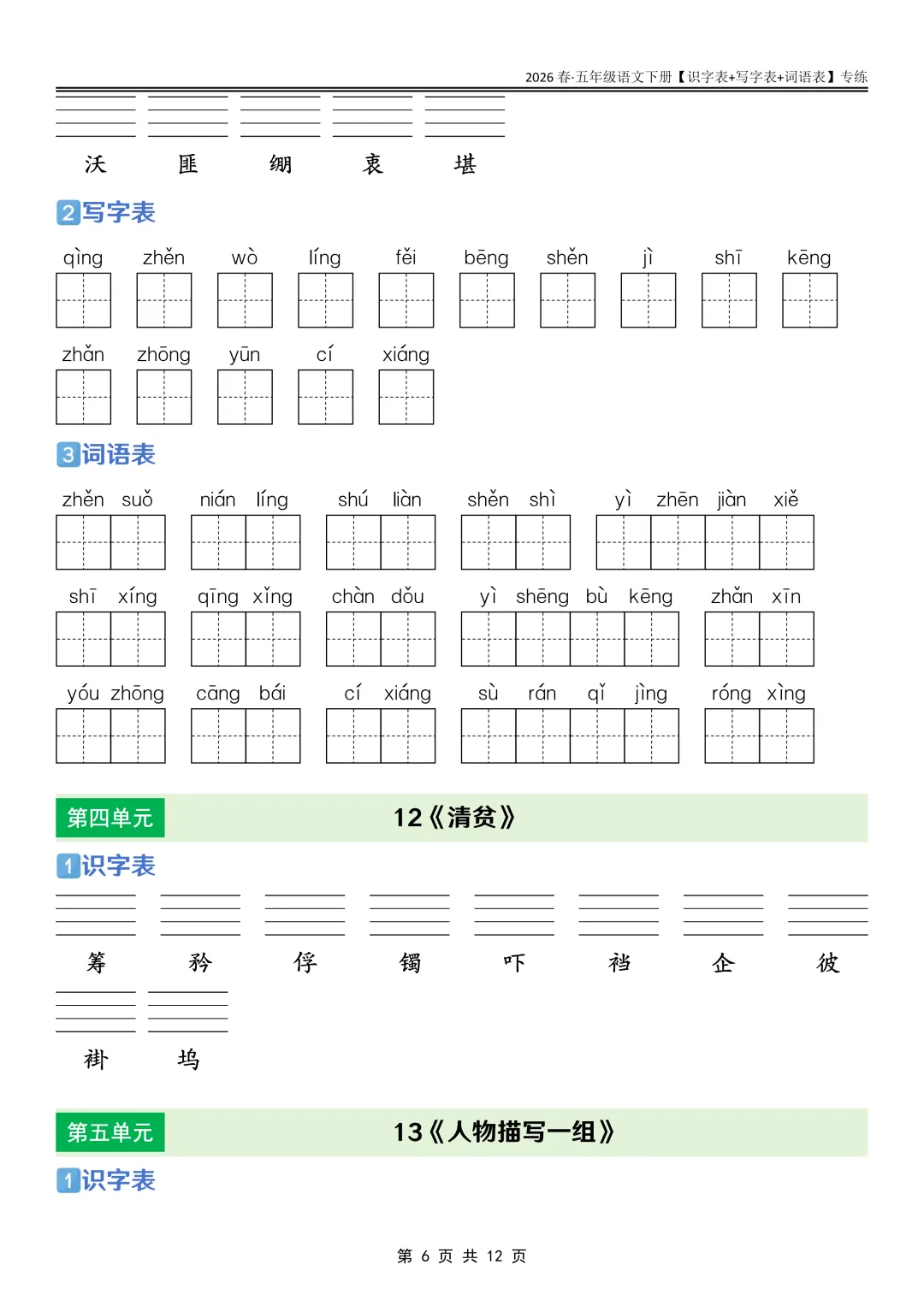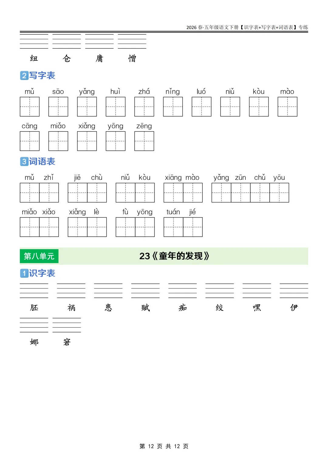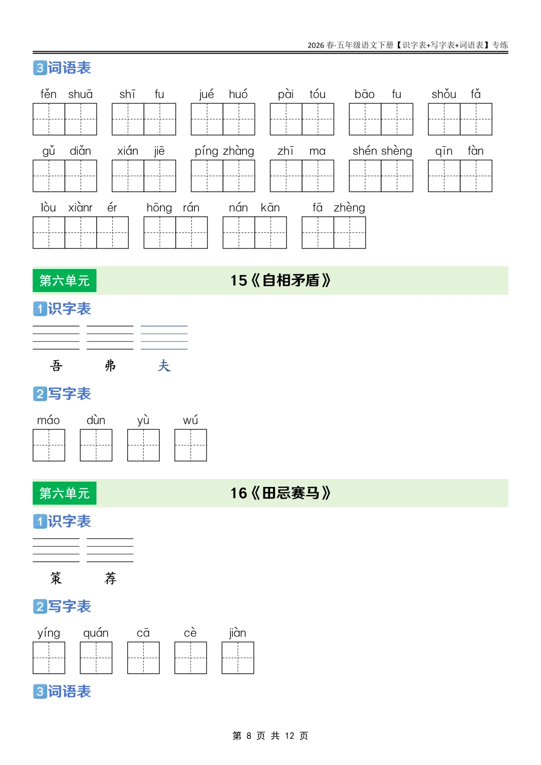 26春语文《课后三表专练》五年级下册,PDF可下载打印