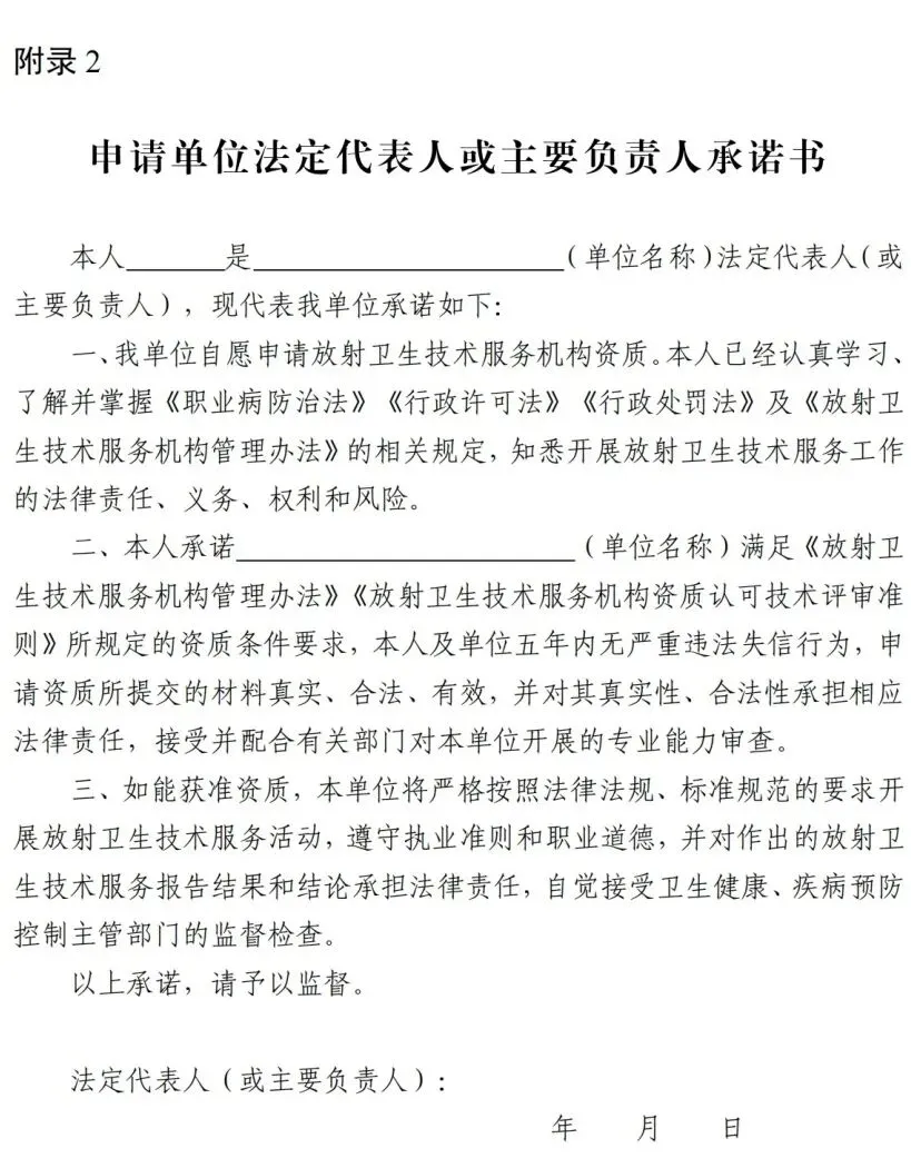 (二)法定代表人或者主要负责人签署的知悉承担放射卫生技术服务的法律责任、义务和风险的承诺书;