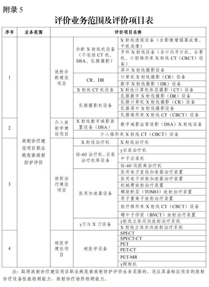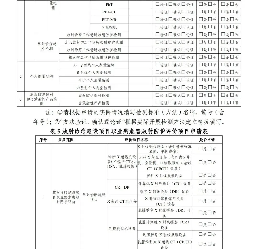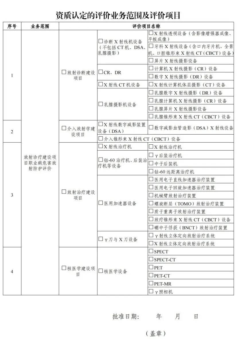 4.审核认定业务范围。专家审核认定申请单位是否满足所申请业务范围要求的检测、评价能力,认定其业务范围(见《放射卫生技术服务机构资质认可技术评审准则》的附录3、附录5)。其中,审核认定放射诊疗建设项目职业病危害放射防护评价业务范围时,应首先审校是否具备相应项目的放射诊疗设备性能检测能力、放射诊疗场所检测能力,不具备检测能力的,不予认定该评价项目。