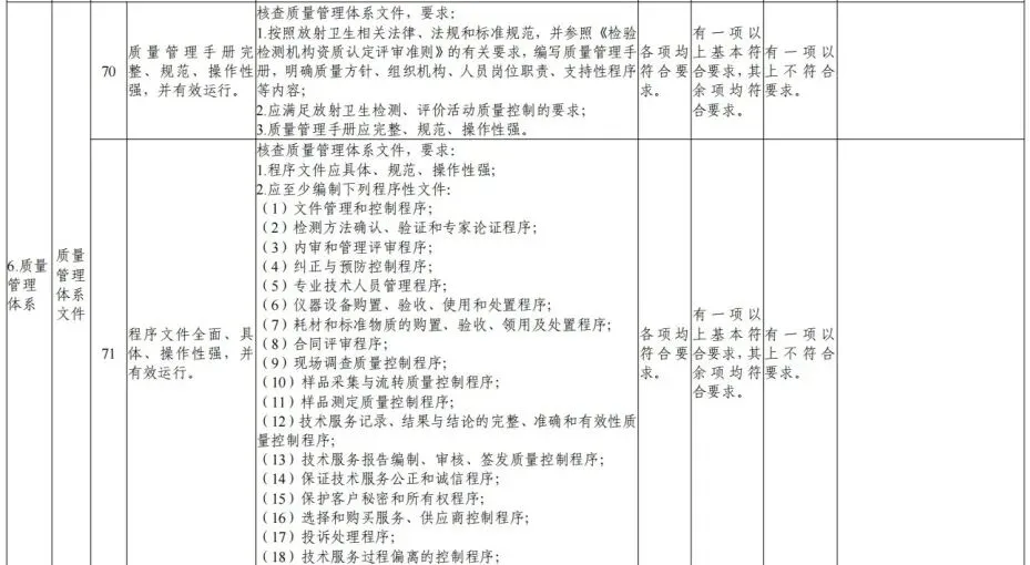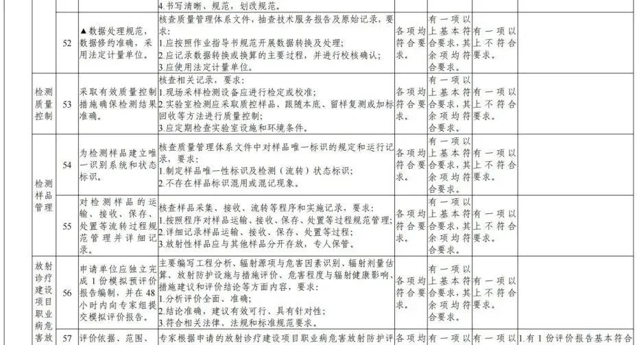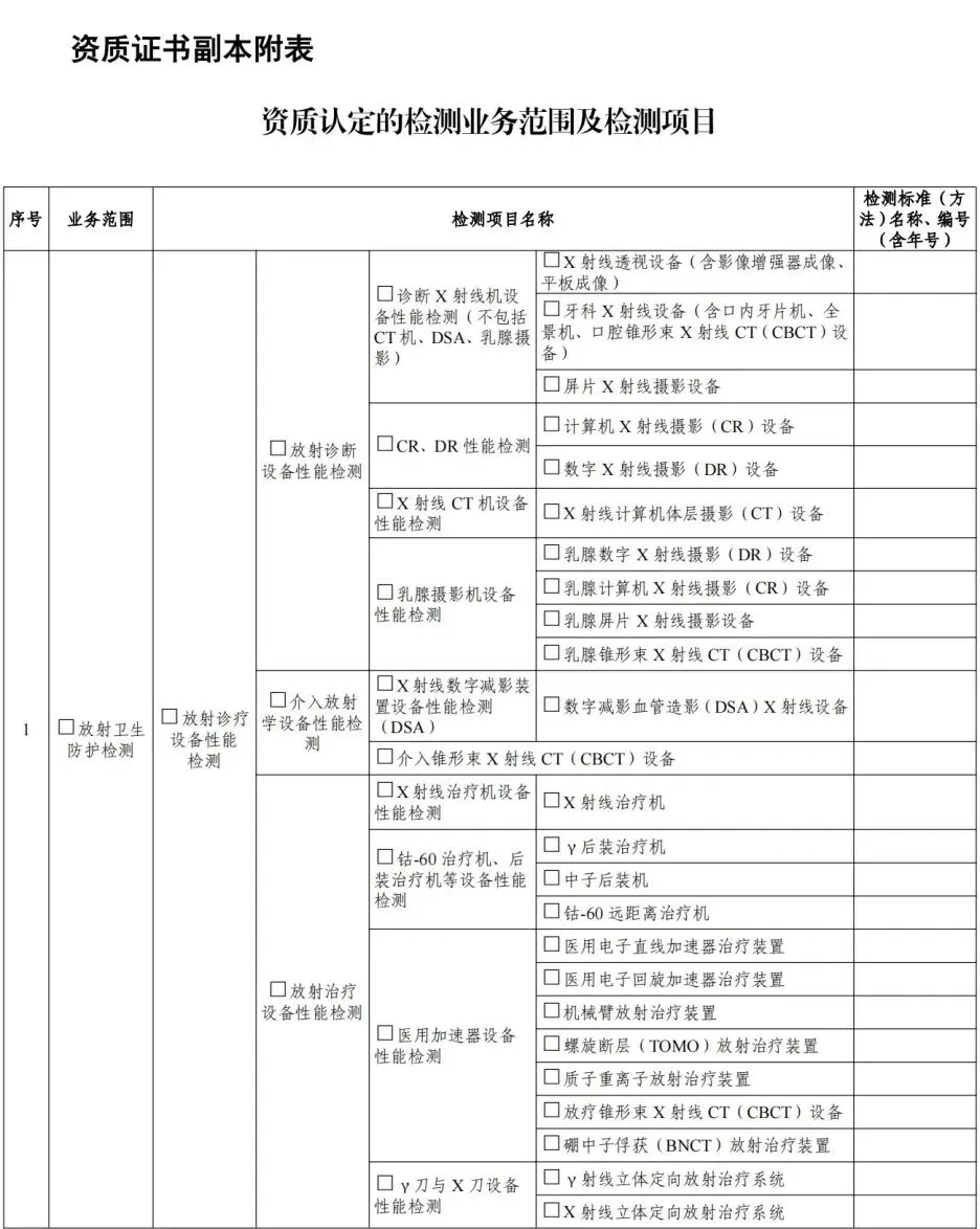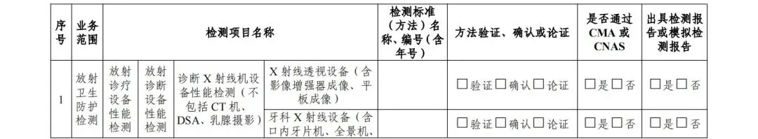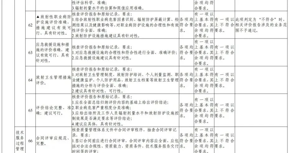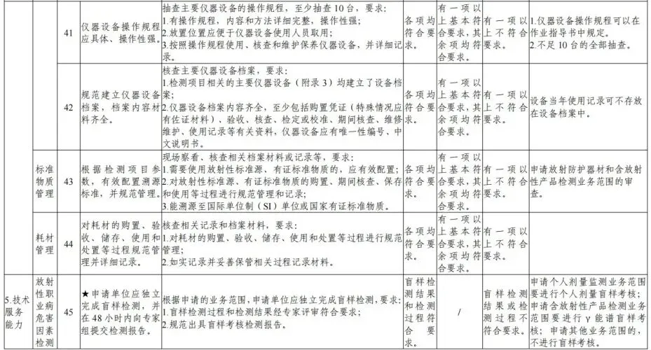 4.审核认定业务范围。专家审核认定申请单位是否满足所申请业务范围要求的检测、评价能力,认定其业务范围(见《放射卫生技术服务机构资质认可技术评审准则》的附录3、附录5)。其中,审核认定放射诊疗建设项目职业病危害放射防护评价业务范围时,应首先审校是否具备相应项目的放射诊疗设备性能检测能力、放射诊疗场所检测能力,不具备检测能力的,不予认定该评价项目。