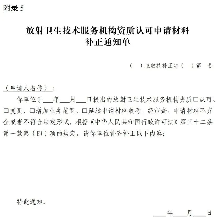 5.放射卫生技术服务机构资质认可申请材料补正通知单