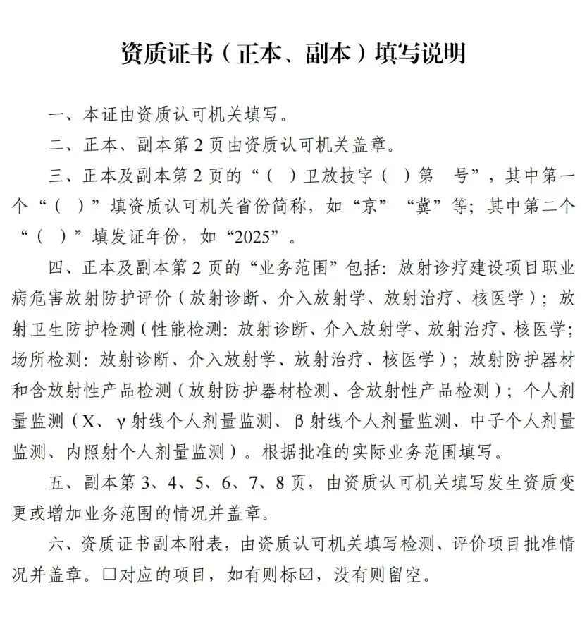 (七)具有与所申请资质、业务范围相适应的检测、评价能力。其中,申请放射诊疗建设项目职业病危害放射防护评价业务范围的,还应具备相应的放射卫生防护检测能力;