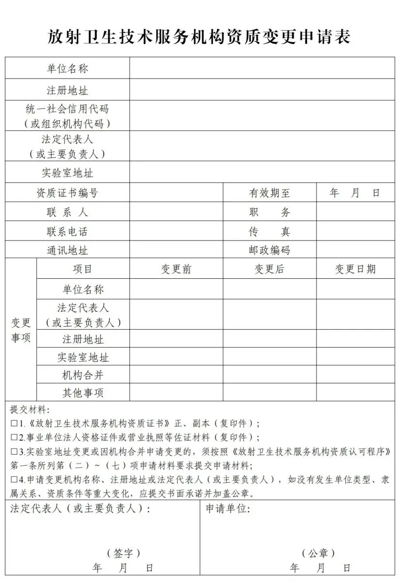 第十七条 申请资质变更的,应向资质认可机关提交《放射卫生技术服务机构资质变更申请表》(见附录10)及相关附件材料。
