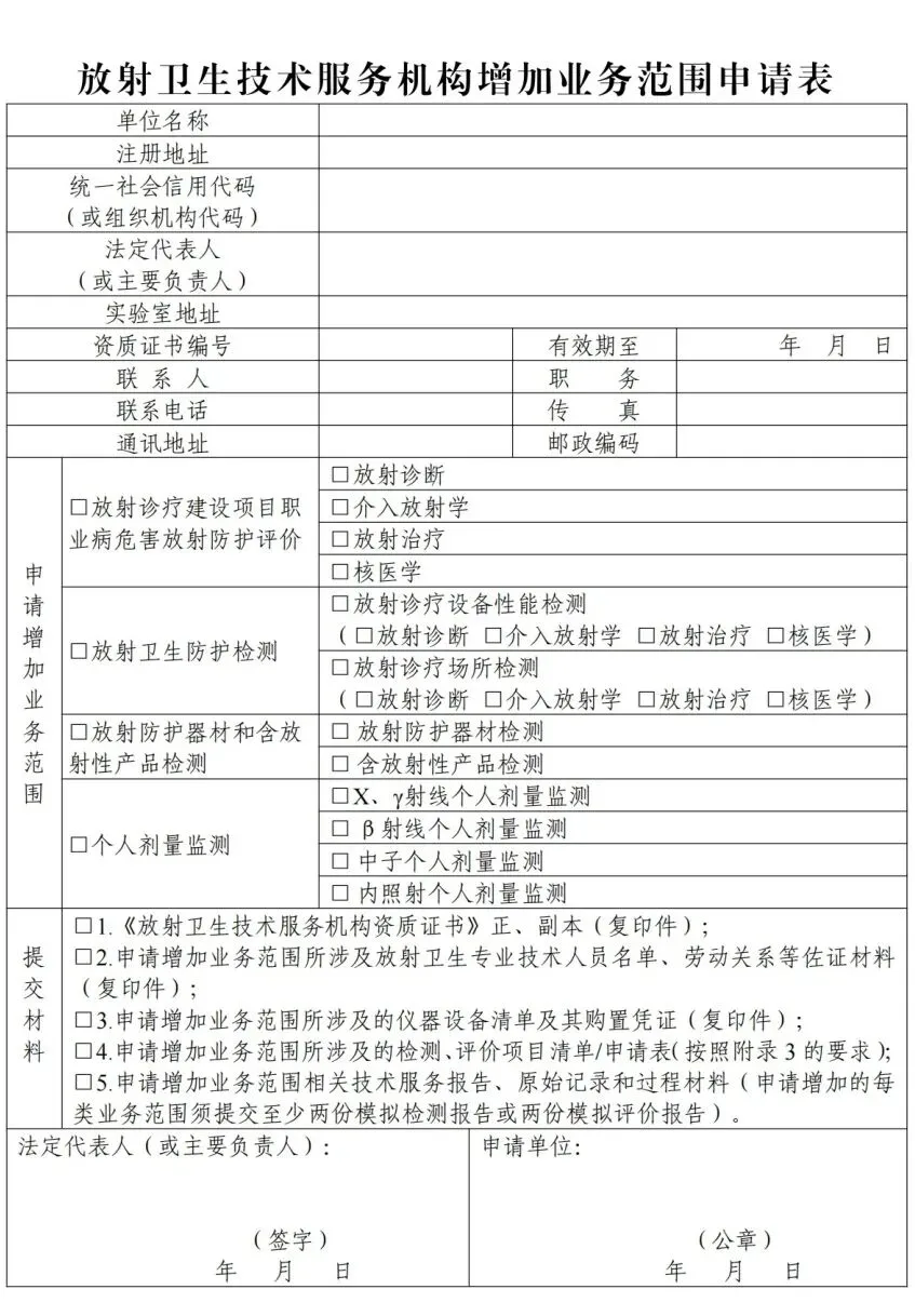 第二十三条 放射卫生技术服务机构取得资质一年以上,需要增加业务范围的,应向资质认可机关提交《放射卫生技术服务机构增加业务范国申请表》(见附录12)及相关附件材料。