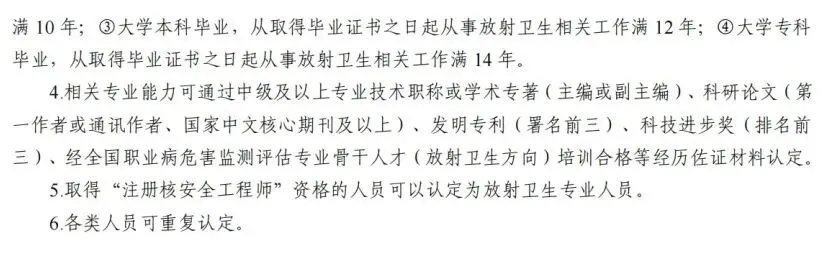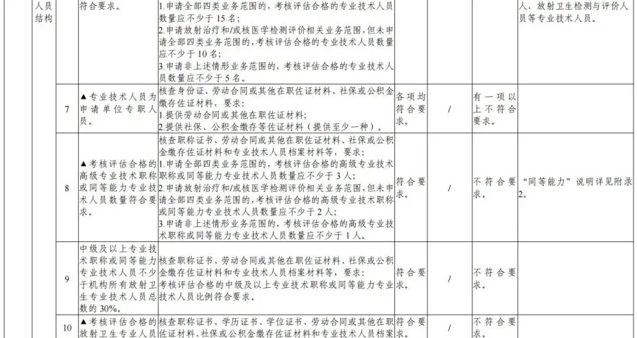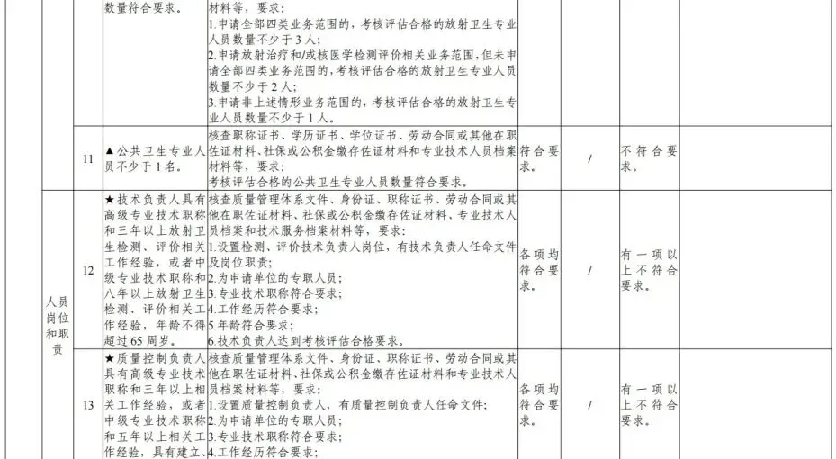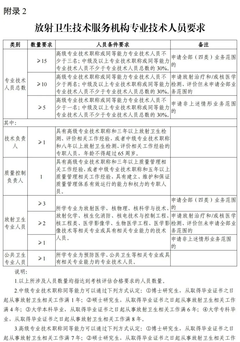 (六)有专职技术负责人和质量控制负责人。专职技术负责人具有高级专业技术职称和三年以上放射卫生相关工作经验,或者中级专业技术职称和八年以上放射卫生相关工作经验。质量控制负贵人具有高级专业技术职称和三年以上相关工作经验,或者中级专业技术职称和五年以上相关工作经验;