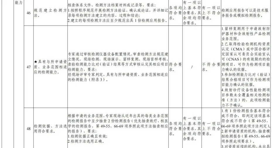 检测方法建立要求:申请单位应编制检测方法验证、确认或论证程序,规范开展检测方法验证、确认或论证,详细记录每项检测方法建立的内容、过程和结论,并规范出具检测应用报告。采用国家标准、行业标准建立的检测方法,应进行方法验证;采用地方标准、团体标准、文献建立的检测方法,应对方法进行确认;采用实验室自行研究制定的检测方法,应对检测方法、技术指标等进行研究,编写研究报告,进行验证并确认,并经至少三名国家级或省级放射卫生检测专家进行审核论证。
