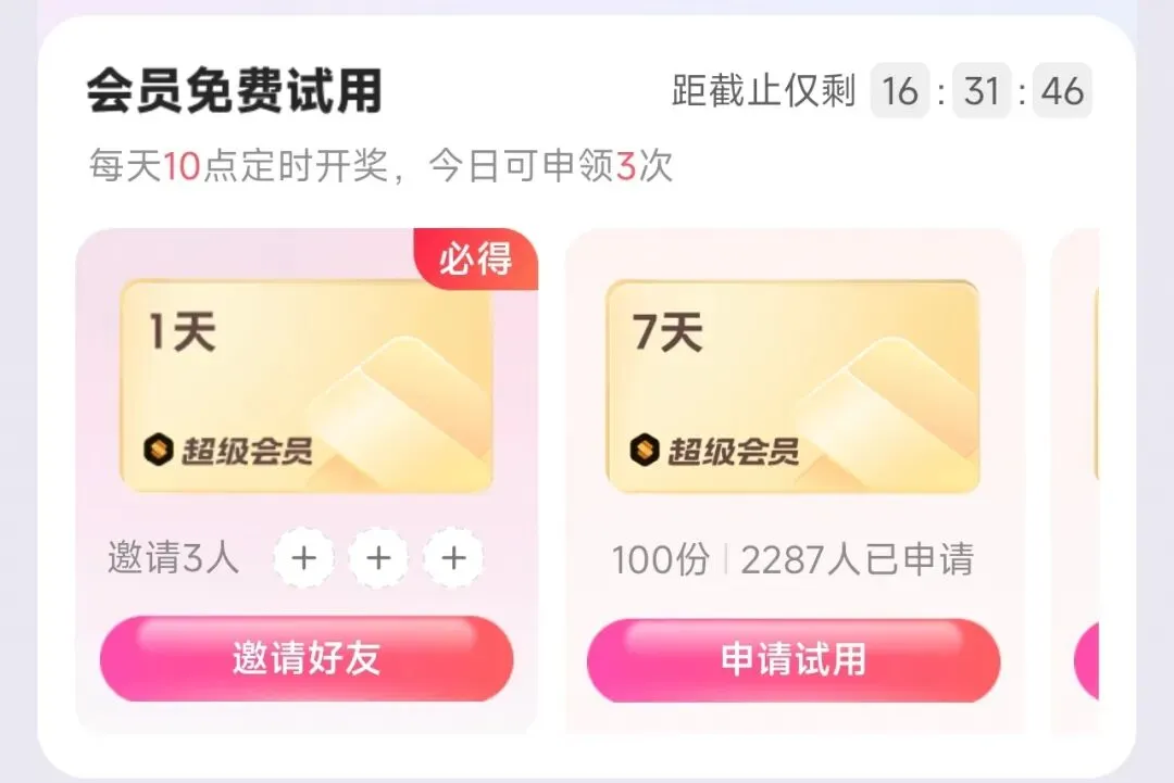 招行掌上生活、淘宝88VIP、京东等,常送 3-7天 会员