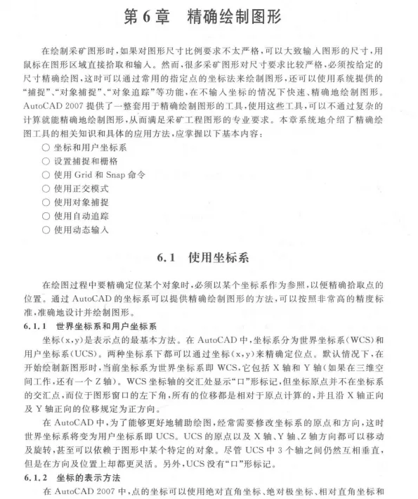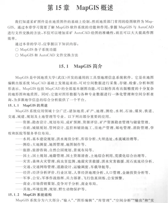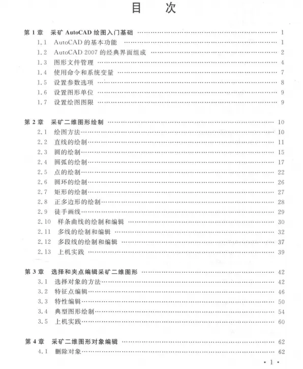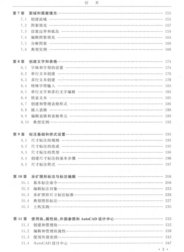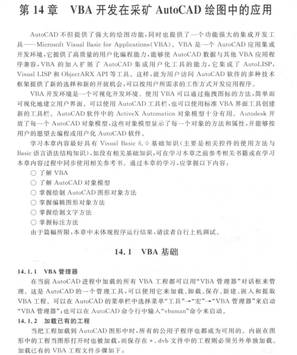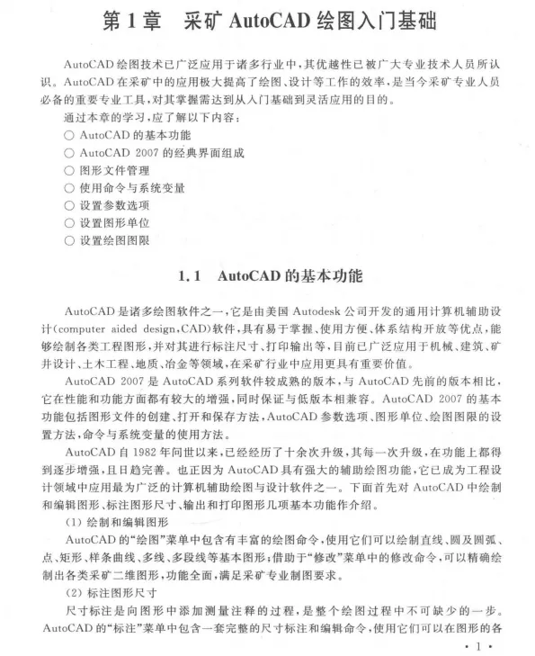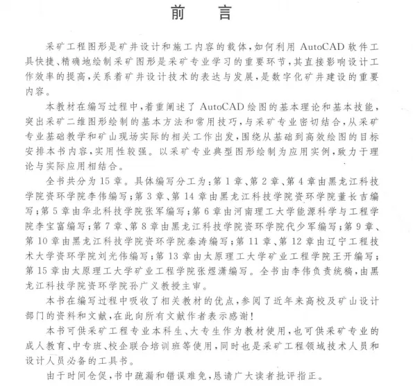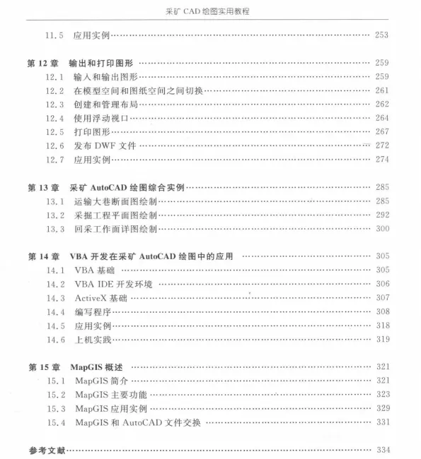 采矿CAD绘图实用教程PDF 全书共分15章,内容主要包括采矿AutoCAD绘图入门基础,采矿二维图形绘制.选择和夹点编辑采矿二维图形,采矿二维图形对象编辑·绘图工具和图层管理,精确绘制图形,面城和图案填充,创建文字和表格,标注基础和样式设置,采矿图形标注与标注编辑使用块 属性块 外部参照和AutoCAD设计中心·输出和打印图形,采矿AutoCAD绘图综合实例,VBA开发在采矿AutoCAD绘图中的应用.MapGIS概述等.