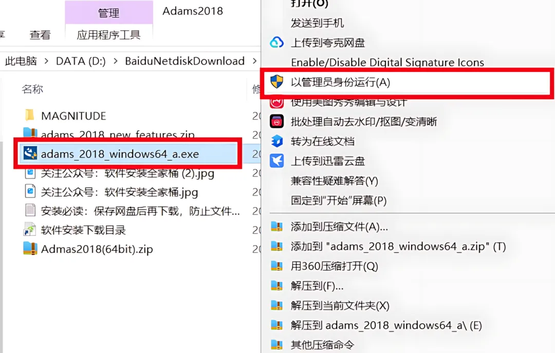 18.打开安装包解压后的【Admas2018(64bit)】文件夹,鼠标右击【adams_2018_windows64_a】选择【以管理员身份运行】。
