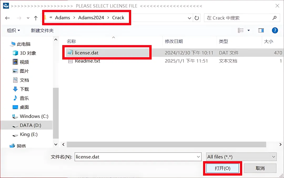 7.打开安装包解压后的【Adams2024(64bit)】文件夹中的【Crack】文件夹并选中【license.dat】,点击【打开】。