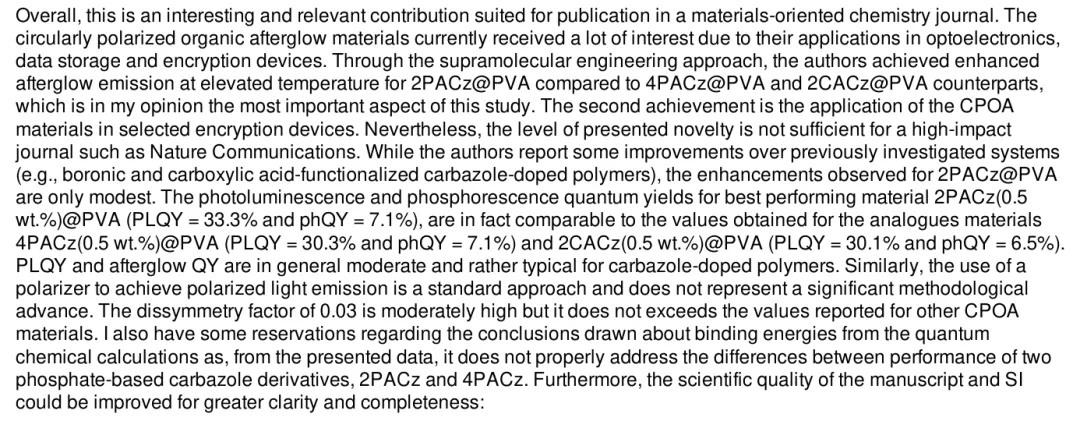 其中,审稿人1认为:研究内容虽然有趣、也具有实际意义,但适合在以材料科学为主的化学期刊上发表,所呈现的新颖性程度不足以让其在像《Nature Communications》这样的高影响力期刊上发表。同时,研究内容提到的:光致发光量子产率和后辉光量子产率总体上属于中等水平,且在碳唑掺杂聚合物中较为典型。此外,该论文及其补充信息的科学质量可以进一步提高,以增强清晰度和完整性。随后,审稿人又给出了6个主要问题、14个小问题。