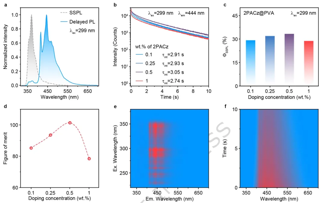 图2d显示了不同掺杂浓度下的品质因数(QFM=PLQY×余辉寿命)。其中,0.5 wt.%掺杂时品质因数最高,综合性能最优。图2e为0.5 wt.% 2PACz@PVA薄膜的激发-延迟PL发射映射图(延迟时间25 ms)。在220-350 nm紫外光激发下,余辉发射峰固定于444 nm,表明激发波长对发射峰位置无影响。图2f为0.5 wt.% 2PACz@PVA薄膜的时间分辨发射光谱。进一步证实444 nm处的长余辉发射源于2PACz的三线态跃迁。