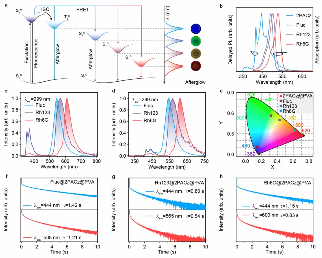 图4f-h显示了三种掺杂薄膜的余辉衰减曲线。在444 nm处,Fluc@2PACz@PVA薄膜的余辉发射带寿命分别从3.05 s降至1.42 s, Rh123@2PACz@PVA薄膜从3.05 s降至0.80 s, Rh6G@2PACz@PVA薄膜从3.05 s降至1.15 s。受体峰处出现长寿命衰减,证实能量转移介导的余辉发射。这些结果表明,非辐射性FRET过程应当是产生多色余辉辐射的主要原因,它使得从能量供体的单重态和三重态激发态到能量受体的单重态激发态的FRET主导过程得以实现。