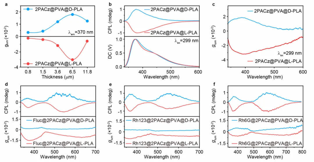 为了实现COA发射,构建了双层叠层聚合物薄膜,其中顶层为聚乳酸手性偏振片层,底层为多色余辉层。通过将手性PLA薄膜纺丝到多色余辉薄膜上,可以很容易地制造出这些堆叠薄膜。在多色余辉体系中引入手性,在此探究PLA厚度对不对成性的影响,实现手性多色余辉的构建。如图5a所示,不同PLA厚度的2PACz@PVA@D/L-PLA薄膜的不对称因子(glum)。PLA厚度为6.5 μm时glum绝对值最大(-3.0×10-2),为最优厚度。2PACz@PVA@D/L-PLA薄膜的圆偏振发光(CPL)光谱与glum值如图5b、c所示。D-PLA与L-PLA体系的CPL信号镜像对称,证实手性传递成功。三种掺杂染料的堆叠薄膜的CPL光谱与glum值。Fluc@2PACz@PVA@D/L-PLA的glum为5.2×10-3,Rh123体系为5.1×10-3,Rh6G体系为2.2×10-3,均实现手性多色余辉发射(图5d-f)。