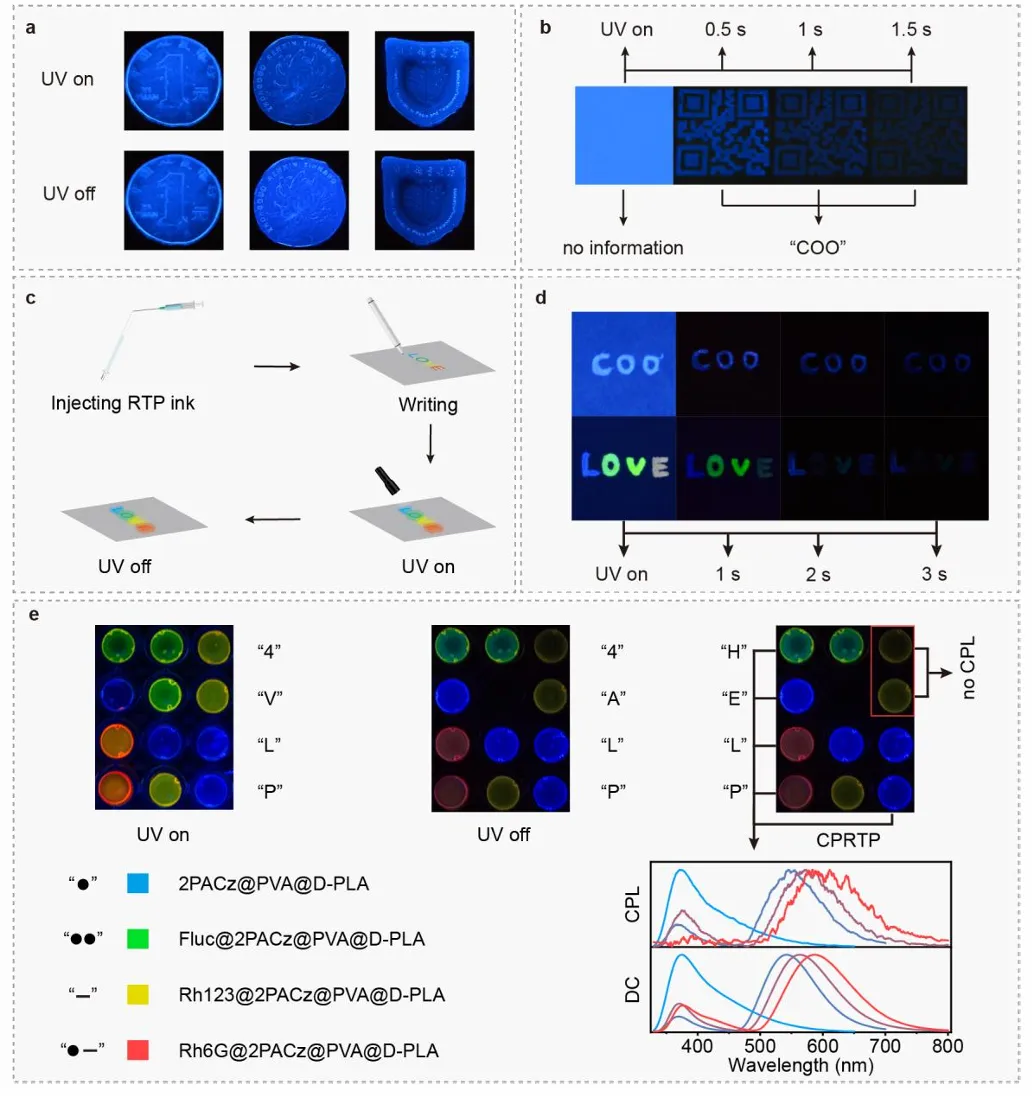 为展示材料的实际应用价值,基于其水溶性、柔韧性、长余辉与手性特性,拓展多色COA聚合物在涂层、防伪、油墨等领域的应用场景。由于堆叠聚合物具有高效的后发荧光和手性特性,从而实现了发光涂层薄膜、防伪加密以及可写入后发荧光墨水。如图 6a 所示,将2PACz@PVA的水溶液直接滴在硬币表面,干燥后便得到了具有硬币表面清晰细节、同时具备柔韧性和透明度的后发荧光薄膜。此外,通过丝网印刷制备的快速响应码(QR码)由于背景荧光干扰而不可见。但去除紫外光后,QR码清晰可见,“COO”信息可通过手机读取(图6b)。