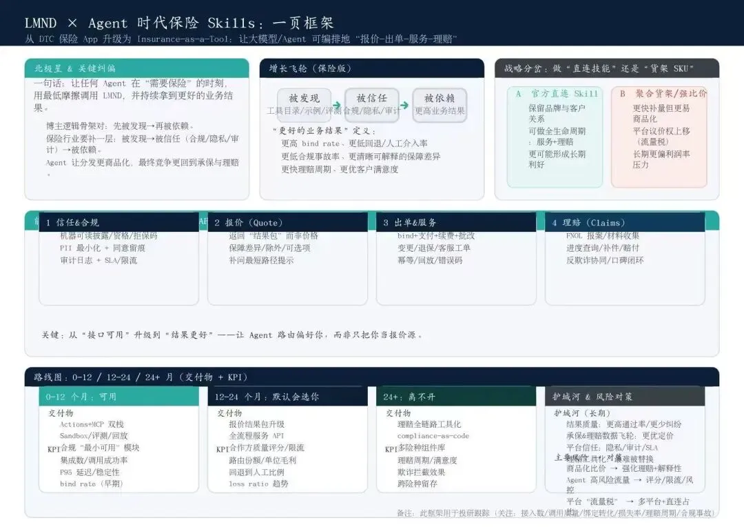 如果 LMND 想成为 Agent 离不开的 insurance skills,至少要把下面这 6 件事,做成一套统一、可拼装的 API:
