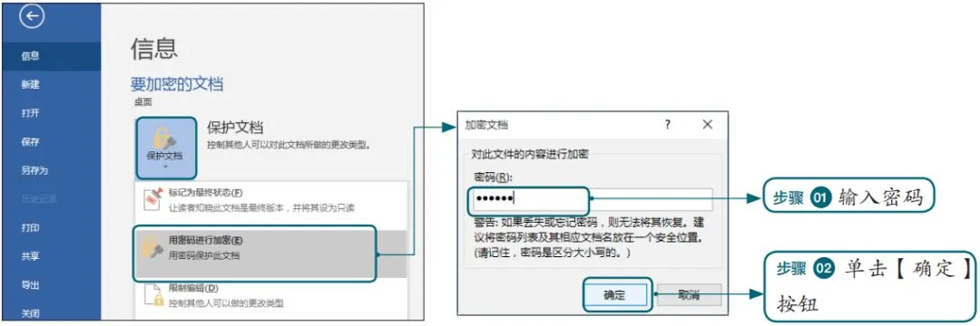 打开“要加密的文档.docx”文档,选择【文件】→【信息】→【保护文档】选项,在弹出的下拉列表中选择【用密码进行加密】选项,在弹出的【加密文档】对话框中输入密码即可,如下图所示。