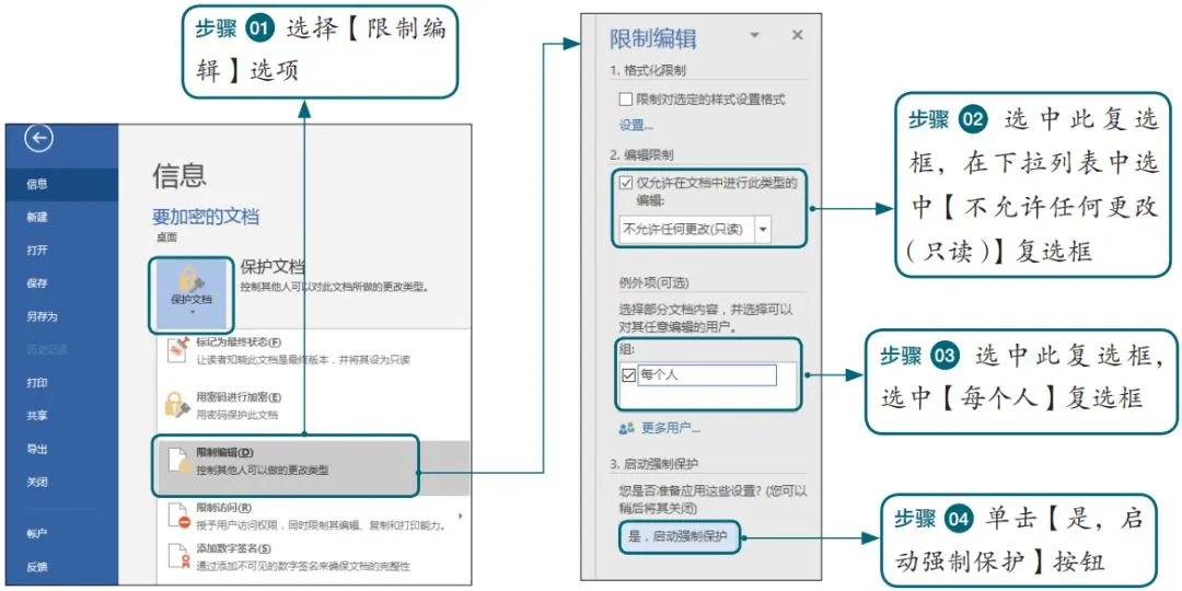 打开“要加密的文档.docx”文档,然后选择【文件】→【信息】→【保护文档】→【限制编辑】选项,在右侧弹出的【限制编辑】任务窗格中进行设置即可,如下图所示。