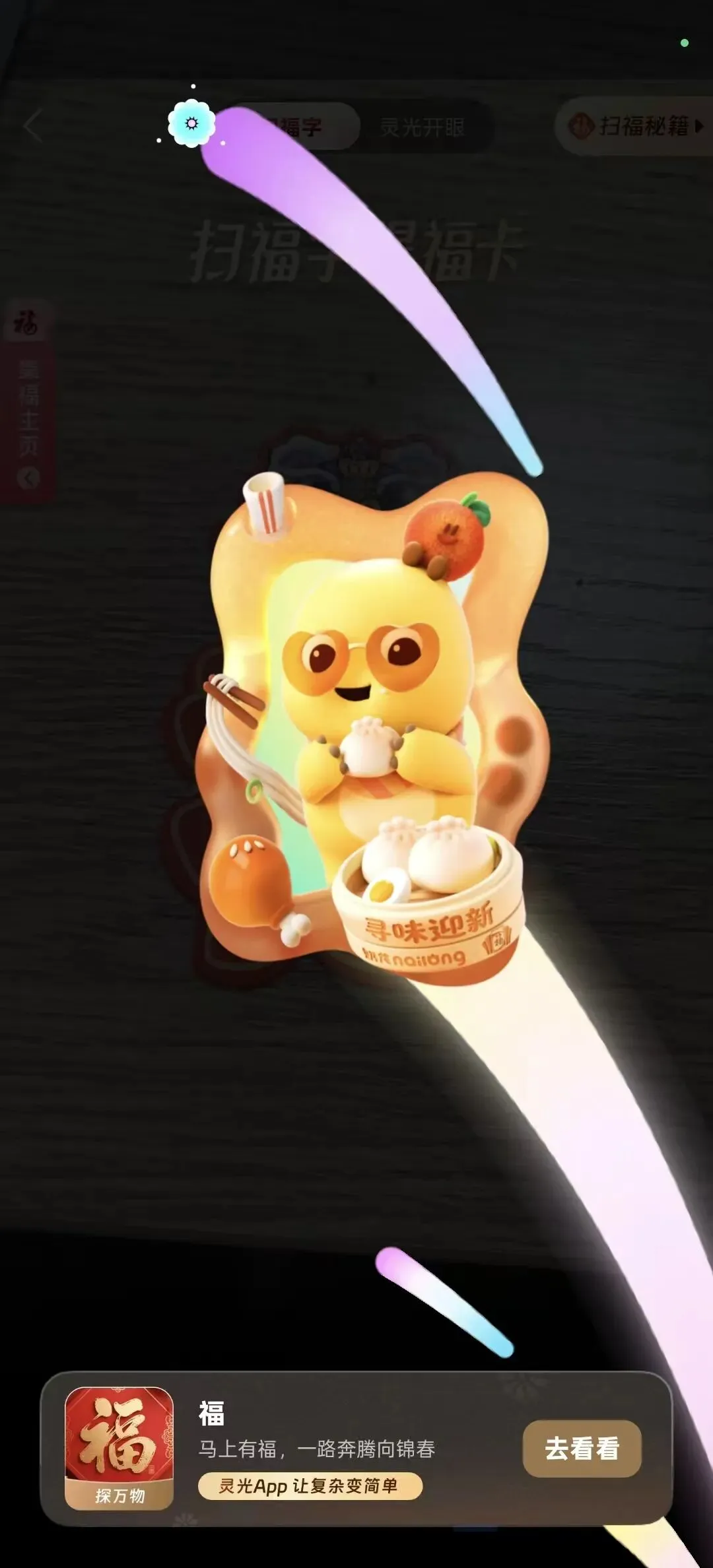 AR扫福:点击「AR扫福」,扫描福字、春联、灯笼等红色物品(截图位置:活动页中间“AR扫福”按钮,跳转相机界面,对准福字即可识别),每天5次机会;