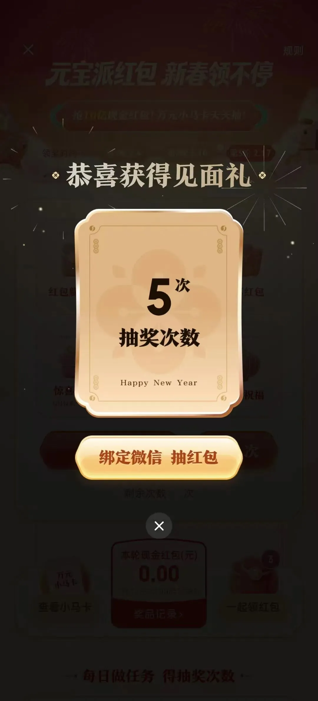 除夕春晚期间,跟着主持人提示操作,每轮互动可额外获得1次抽奖机会,大奖集中在20:00-24:00;