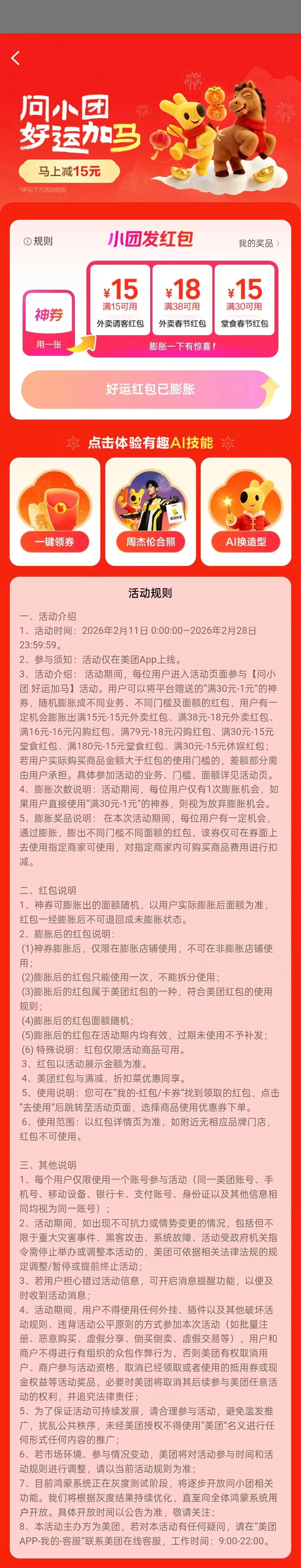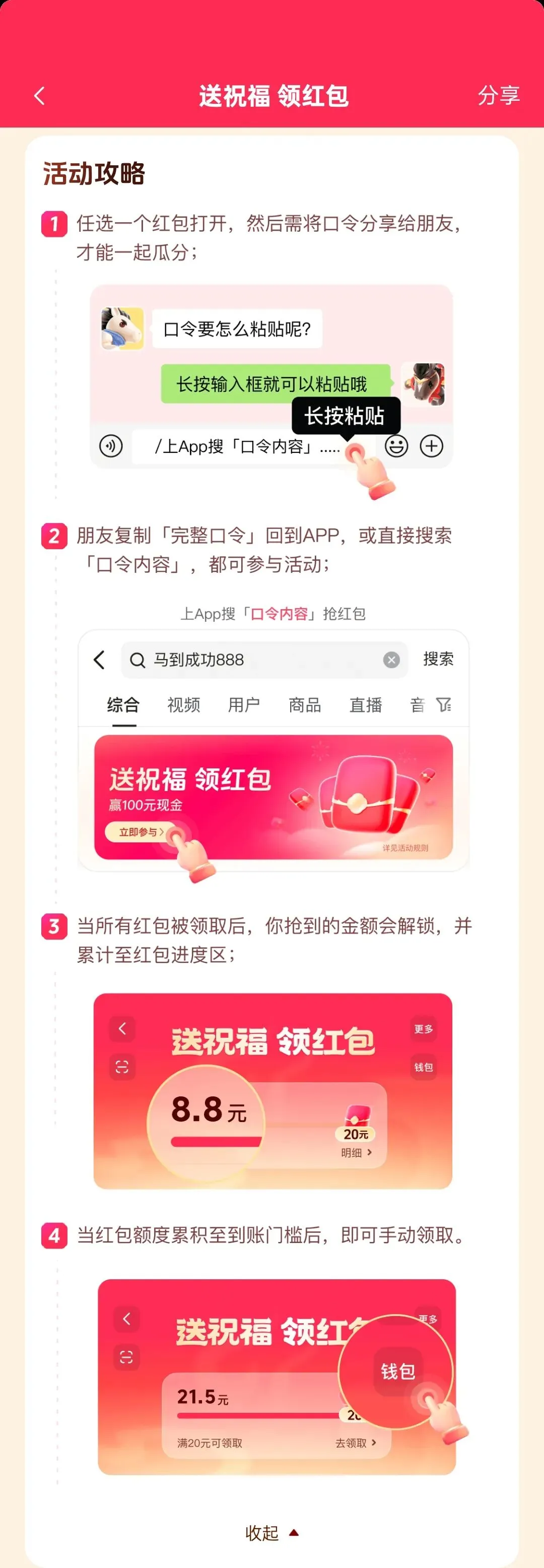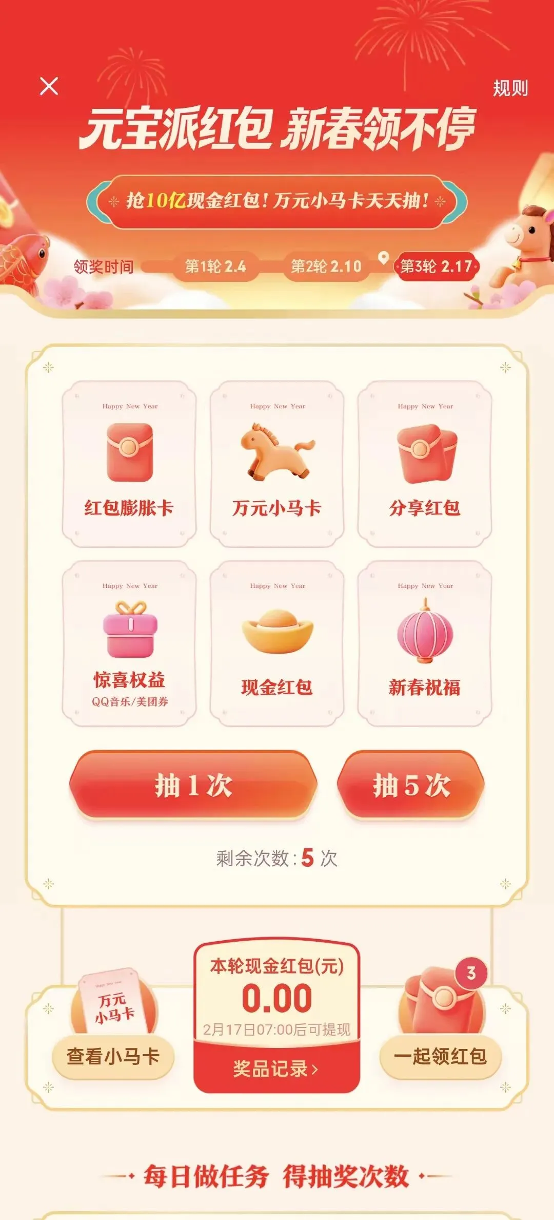 活动时间:预热场2月13日-2月16日12:00;除夕主场2月16日20:00-24:00(春晚同步);领奖场2月17日6:00起可提现。