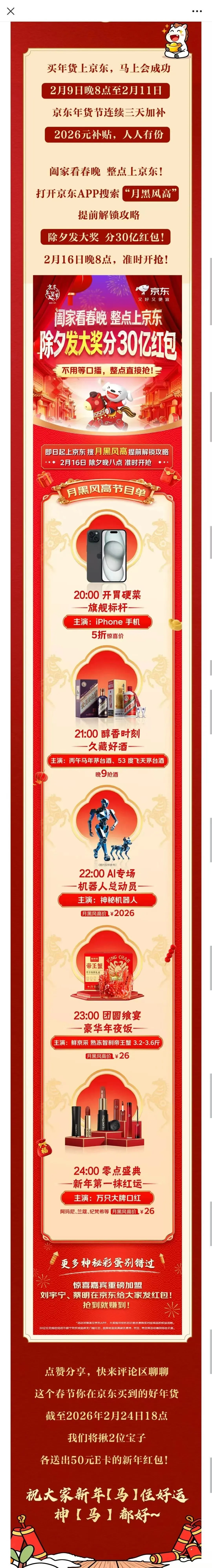 核心福利:30亿福利,现金红包+购物补贴,除夕整点抢5折iPhone、茅台酒,还有AI数字人直播红包,购物可直接抵扣。