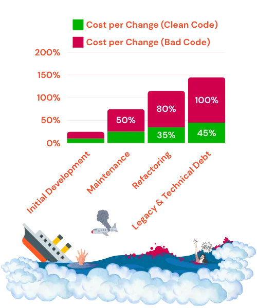 到了代码变成遗留代码时,坏代码的变更成本达到100%——现在升级它非常昂贵,而整洁代码仍然更易于管理,仅为45%。