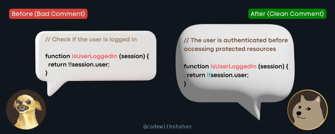 这个注释不好,因为它没有解释 isUserLoggin() 的存在原因。它只是解释了正在发生的事情。但我们已经知道这是一个身份验证函数。这个注释是浪费时间。