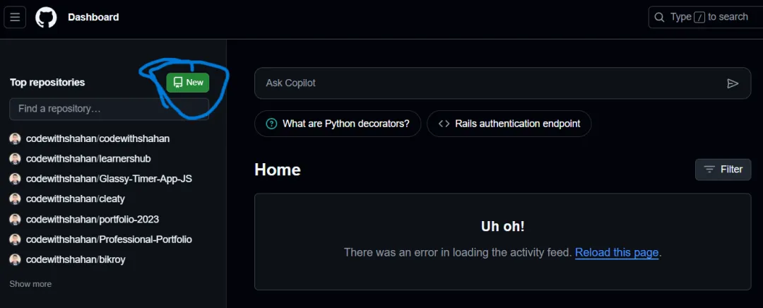 或者您可以在不使用命令的情况下从 GitHub 账户创建一个新的代码库。只需登录到您的 GitHub 账户并访问仪表板。您会发现一个“New”按钮来创建一个全新的代码库: