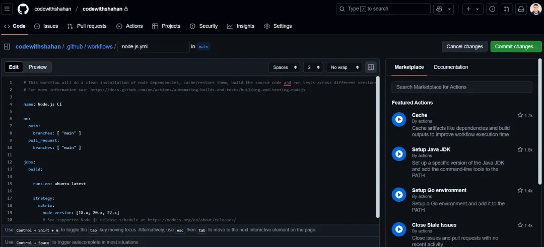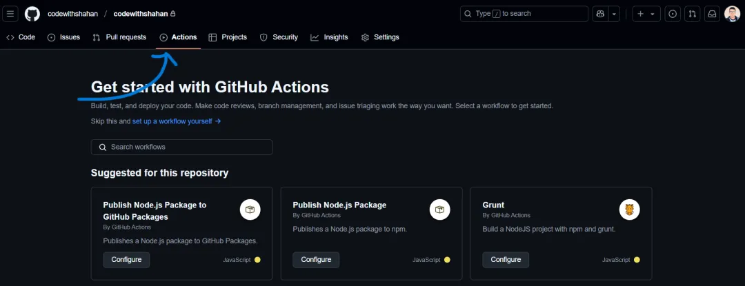 导航到您代码库的 Actions 选项卡。要执行此操作,首先您必须访问 GitHub 上的代码库(创建代码库后您会找到链接)。在此示例中,我创建了一个名为“codewithshahan”的新代码库。在这里,看一下导航栏右侧的 Actions 选项卡。