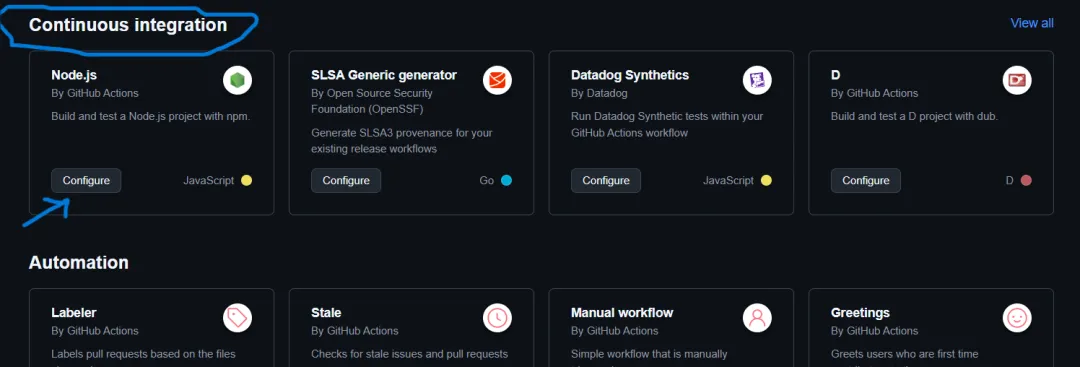 进入 Actions 选项卡后,向下滚动一点,您会找到 continuous integration 部分: