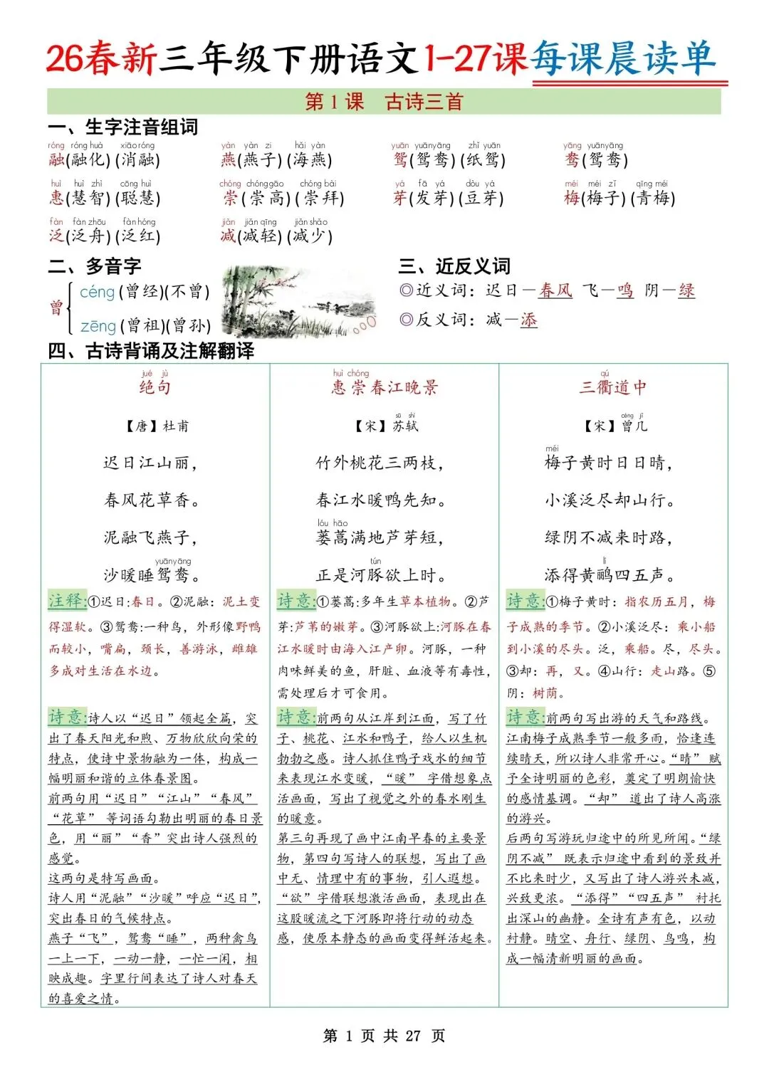 本期分享:26春三年级下册语文每课知识晨读单,如果觉得不错的话,可以转发分享到班级群/年级群,让家长打印出来,帮助孩子学习哦!