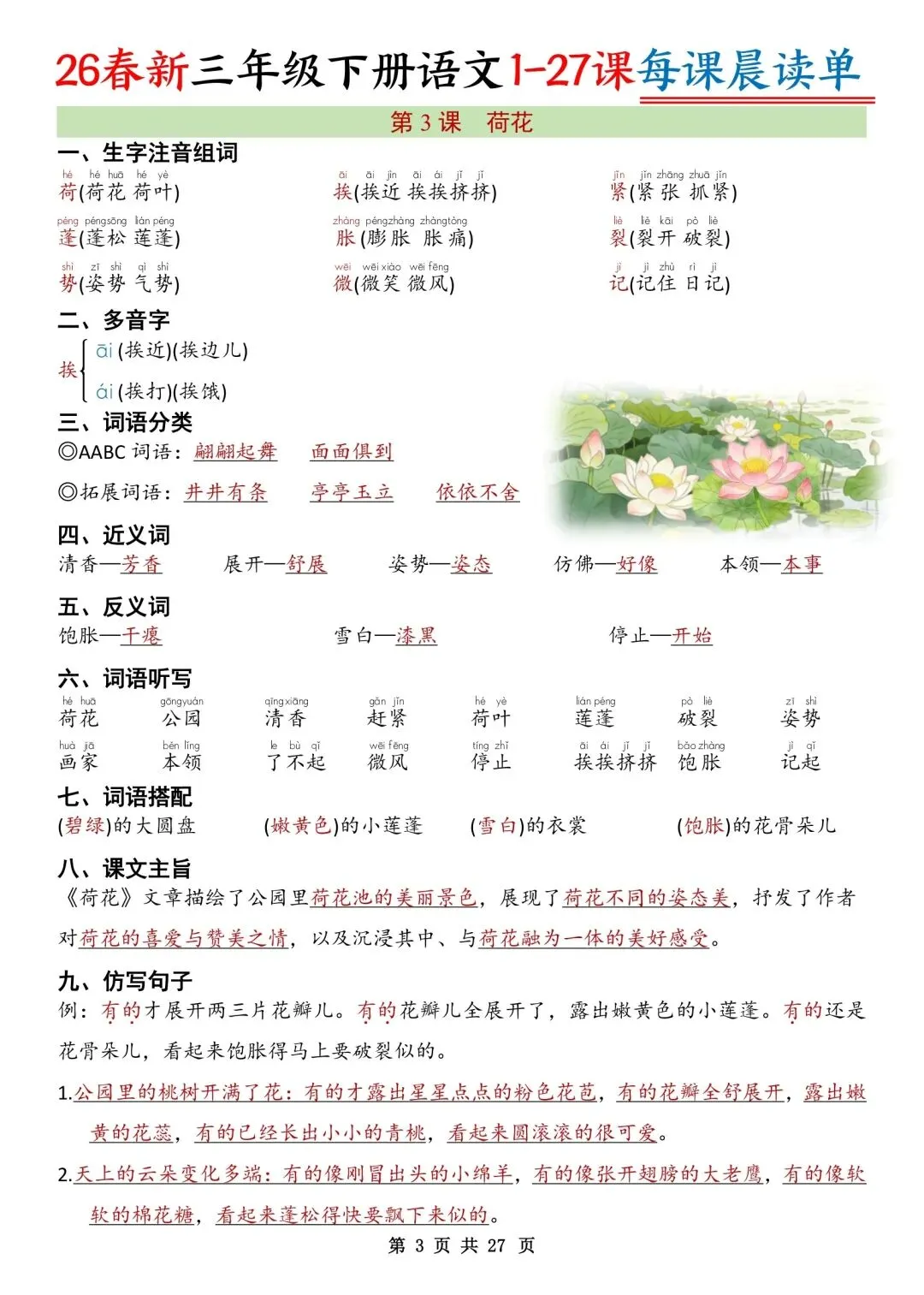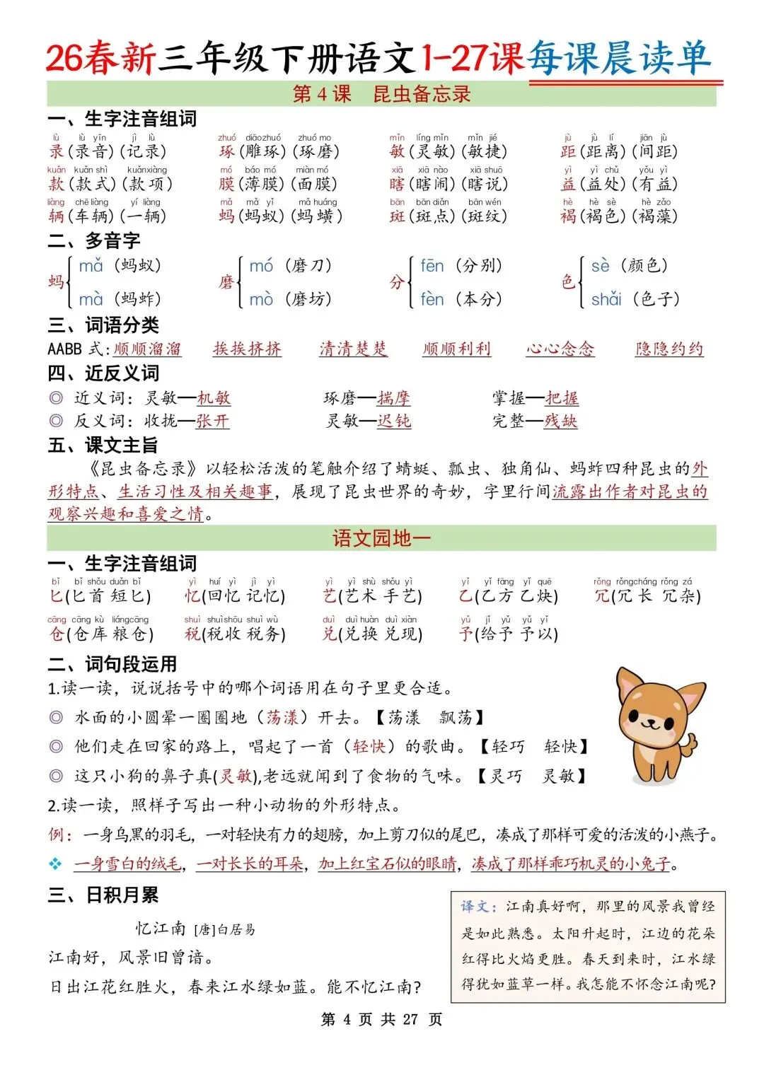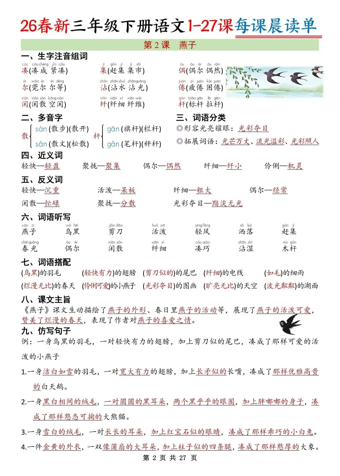 26春三年级下册语文每课知识晨读单,PDF电子版可打印