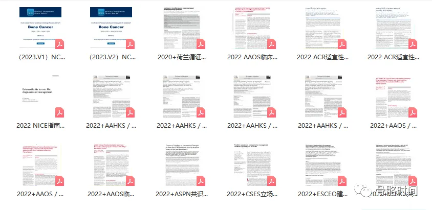 干货!2022-2023年骨科指南共识PDF版合集! 骨科指南福利来啦 本期要和大家分享的是 2022年度指南共识合集 以及2023年最新指南共识 全都是高清PDF版!! 希望能为读者的临床科研工作带来帮助 【划至文末免费领取】 指南内容包含骨折、颈椎病、膝关节置换术、骨质疏松、半月板病变、脊柱炎等,以上仅展示部分,文末领取后可自行查看。 免费领取方式 1.点击下方名片关注:骨骼时间 2.进入公众号发送“ 30 ”领取
