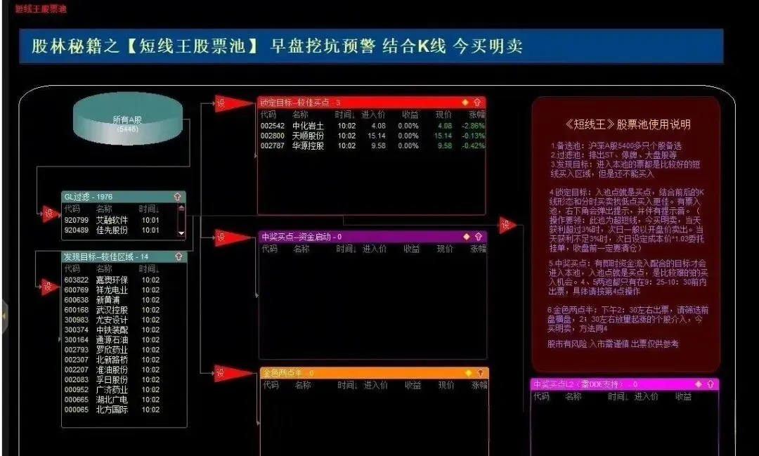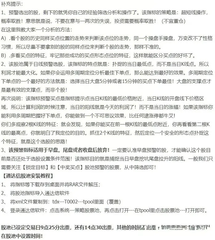1. 避坑指南- 规避高位股:近期涨幅>30%的个股需手动排除- 警惕假信号:若预警后5分钟内未出现分时放量(量比<1.2),放弃操作