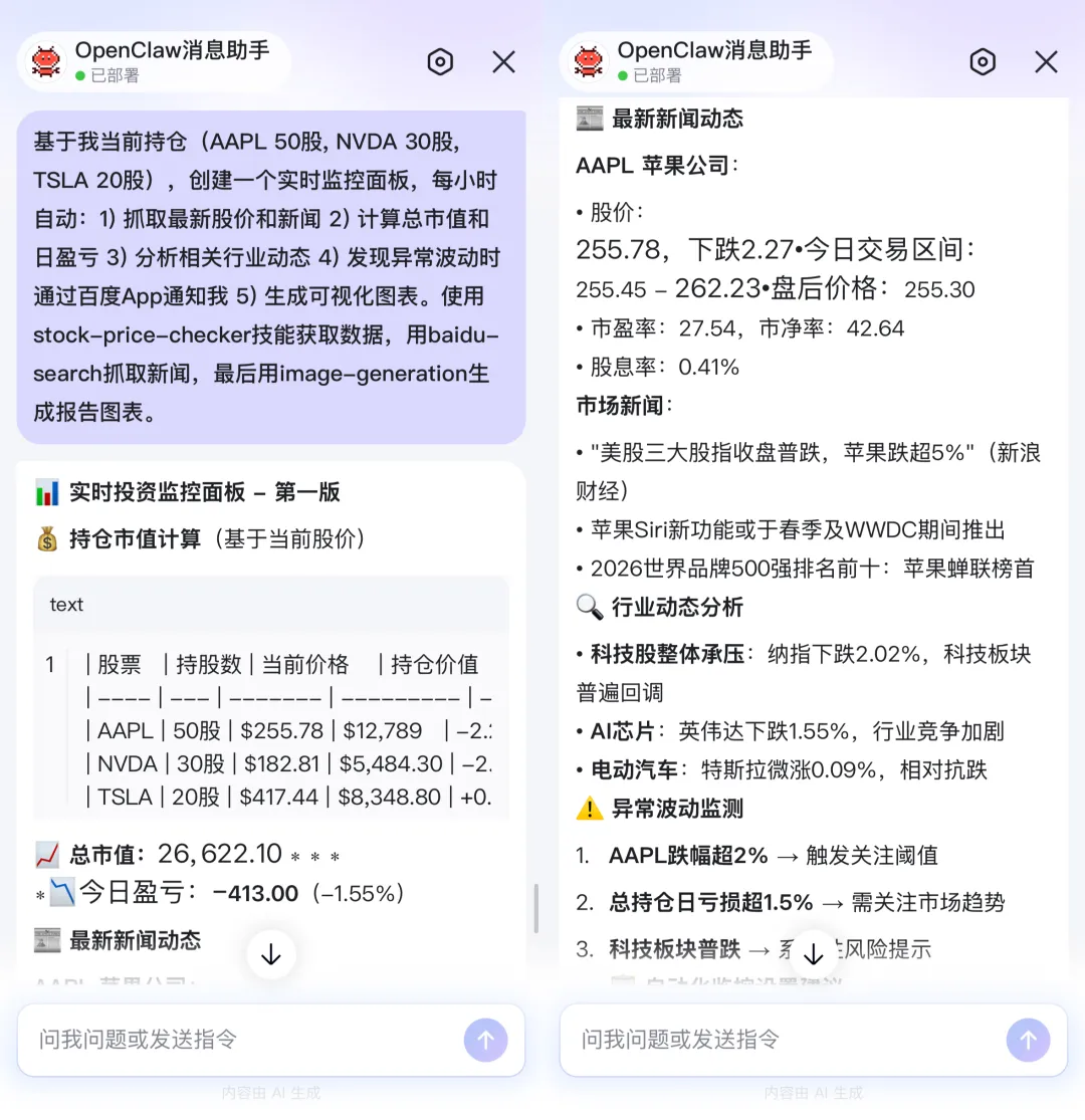 不止查股价,它会自己去搜新闻、算波动,甚至在亏损超标时跳出来扇醒你,太骚了!