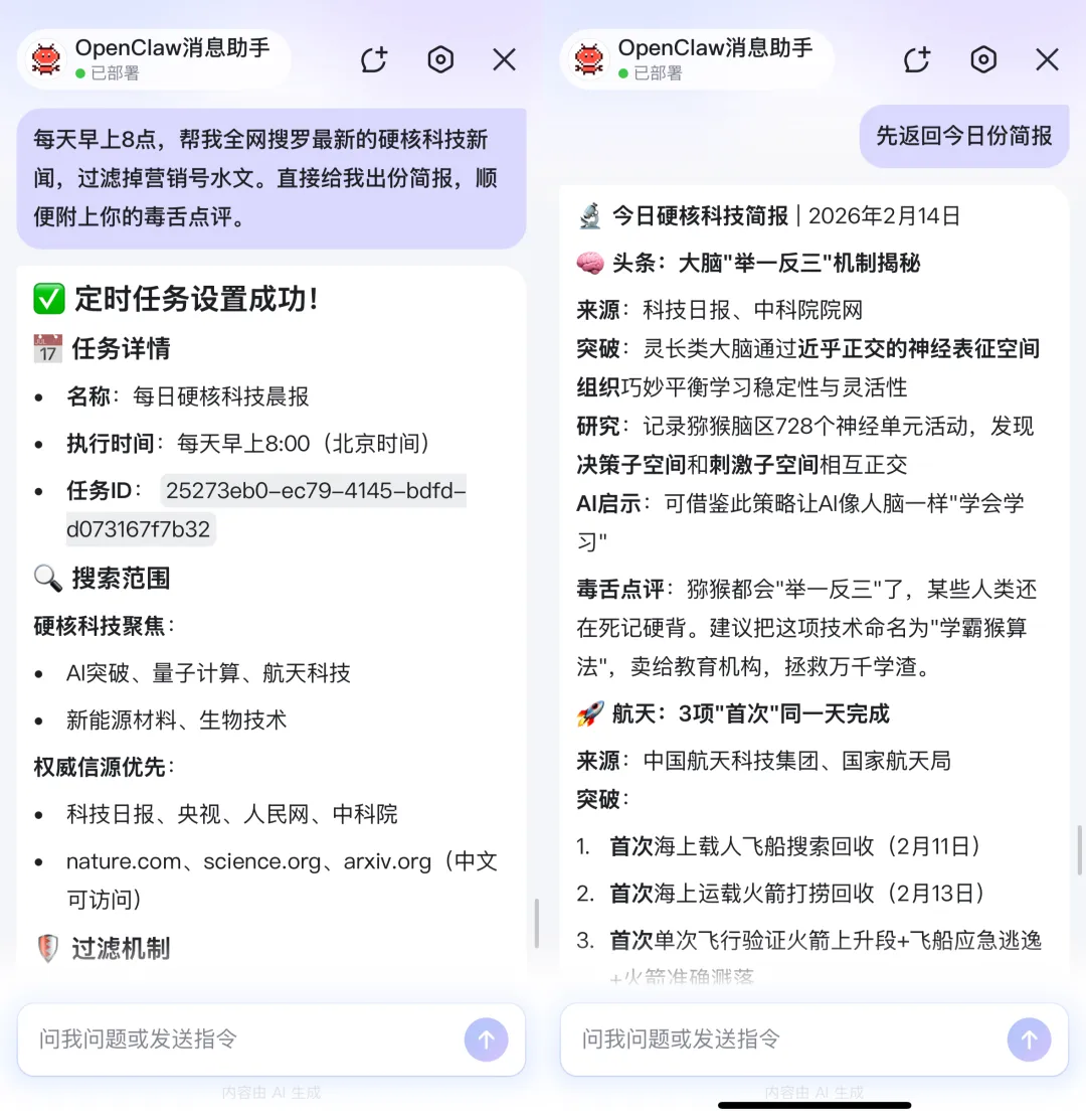 @OpenClaw 每天早上8点,帮我全网搜罗最新的硬核科技新闻,过滤掉营销号水文。直接给我出份简报,顺便附上你的毒舌点评。