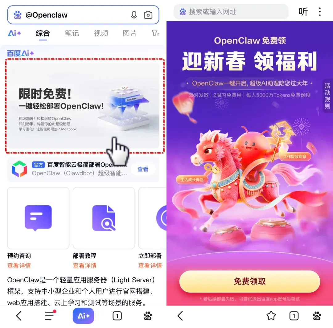 只需打开你手机里的百度App,在搜索框“@OpenClaw”,就能一键免费激活!