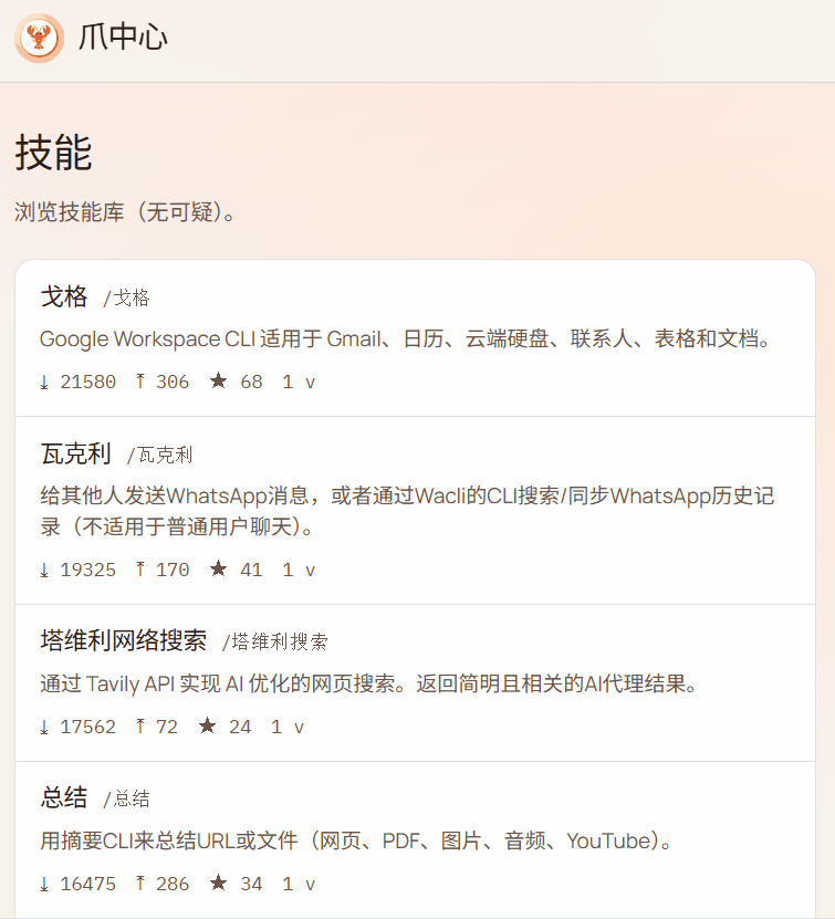 直接访问 Clawhub 的 Skills 列表,想装哪个直接跟它说就行。