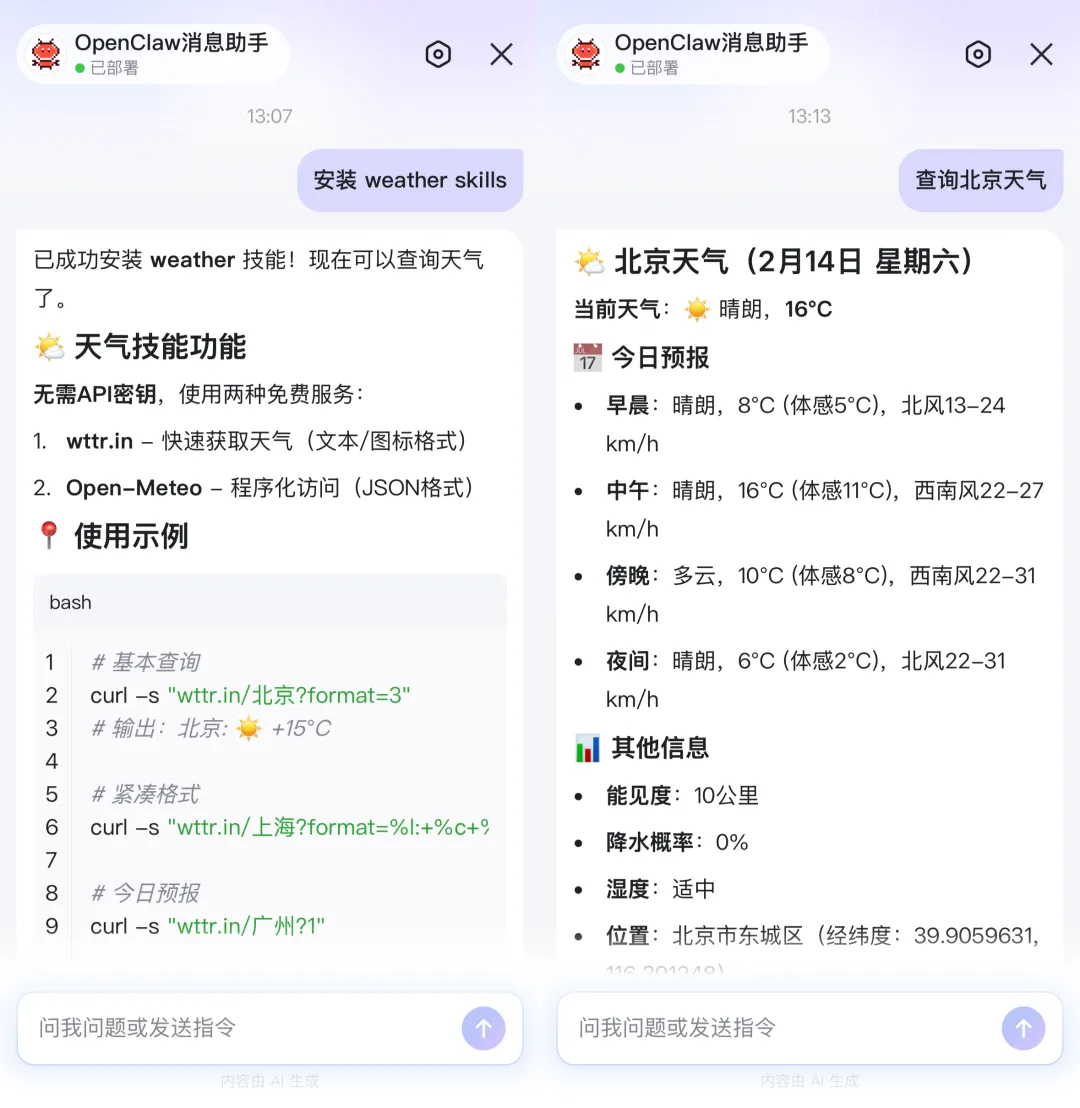 比如让它帮我安装天气 Skills。