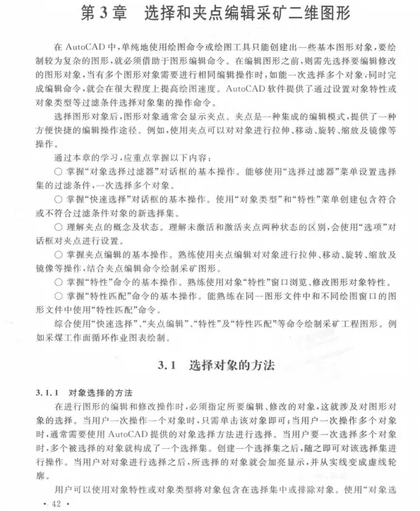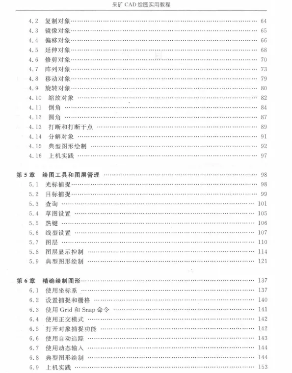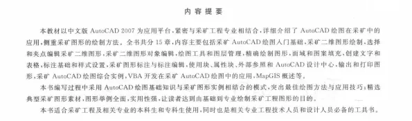 采矿CAD绘图实用教程PDF 全书共分15章,内容主要包括采矿AutoCAD绘图入门基础,采矿二维图形绘制.选择和夹点编辑采矿二维图形,采矿二维图形对象编辑·绘图工具和图层管理,精确绘制图形,面城和图案填充,创建文字和表格,标注基础和样式设置,采矿图形标注与标注编辑使用块 属性块 外部参照和AutoCAD设计中心·输出和打印图形,采矿AutoCAD绘图综合实例,VBA开发在采矿AutoCAD绘图中的应用.MapGIS概述等.