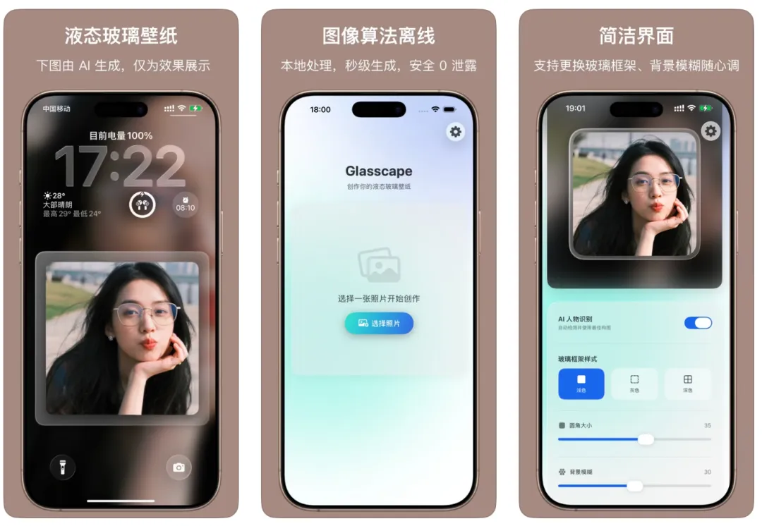 App Store 发现了一个宝藏神器!快来试试 大家好!分享一款可以制作出液态玻璃、空间效果及3D效果的壁纸软件,目前免费无弹窗! Glasscape – 液态玻璃壁纸 软件可以将相册照片快速转化为液态玻璃质感壁纸,导入照片,它会AI智能检测照片最佳区域并使用,内置了多种风格选项,可以设置圆角大小、背景模糊,最后保存到相册中。 获取方式 软件不清楚是否为限免,当前可以免费安装,感兴趣的朋友可以去试试,安装需 iOS 18 及以上。