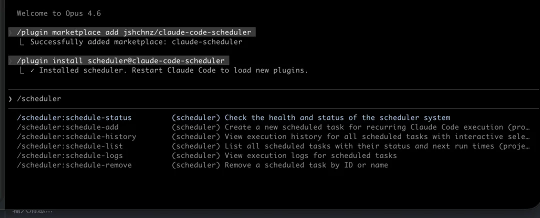 /pluginmarketplace add jshchnz/claude-code-scheduler/plugininstall scheduler@claude-code-scheduler