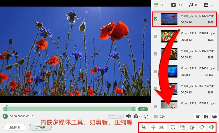 3. 录制结束,通过软件内置【高级编辑】工具进行视频分段、删减、加特效等优化,优化后导出保存。